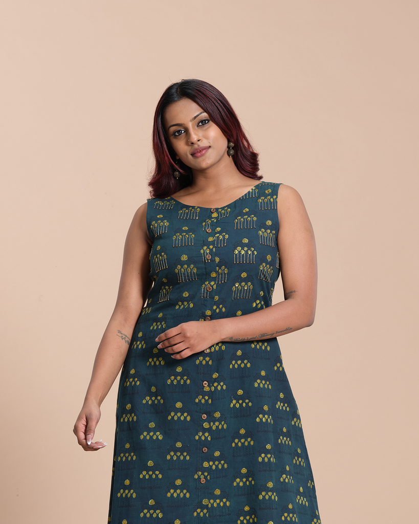 FOREST GREEN FLORAL PRINT STRAIGHT CUT COTTON KURTHI