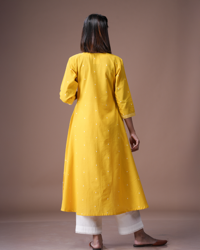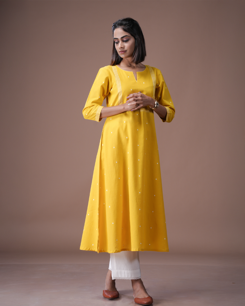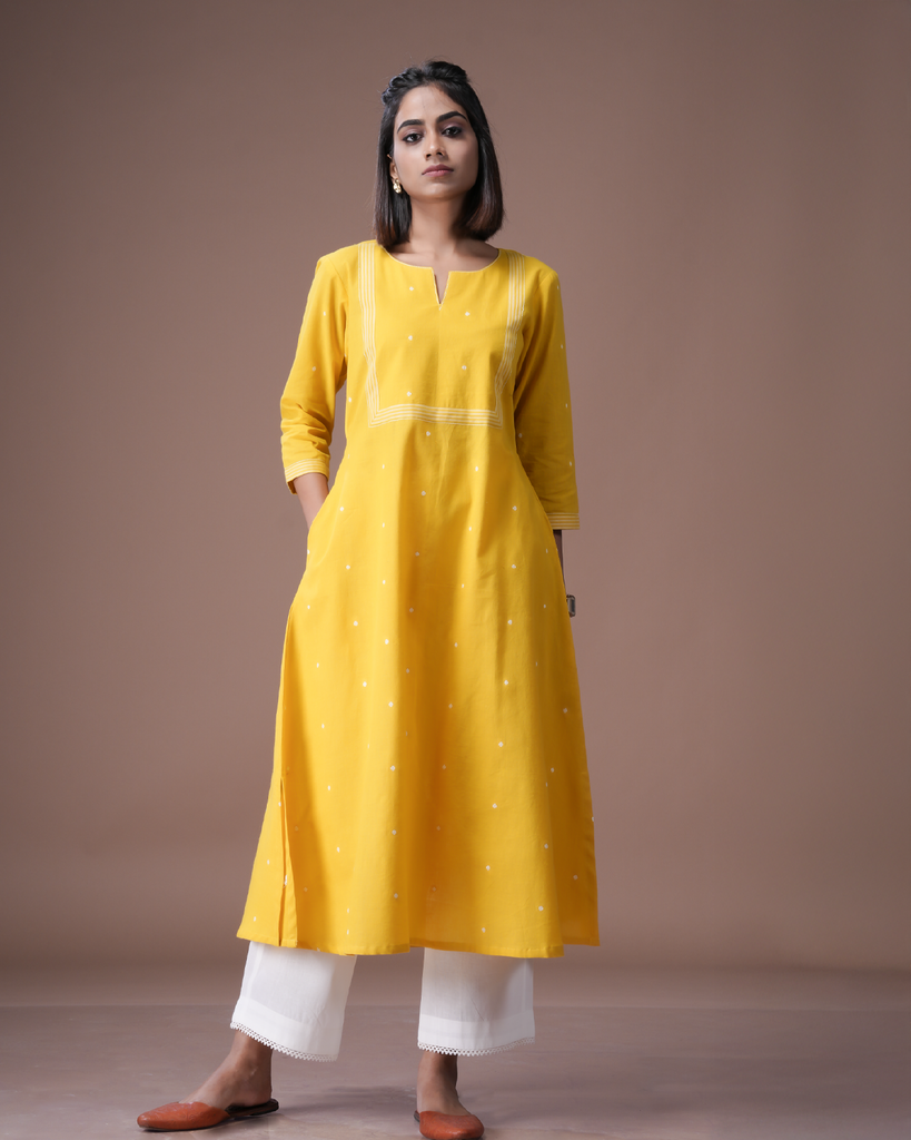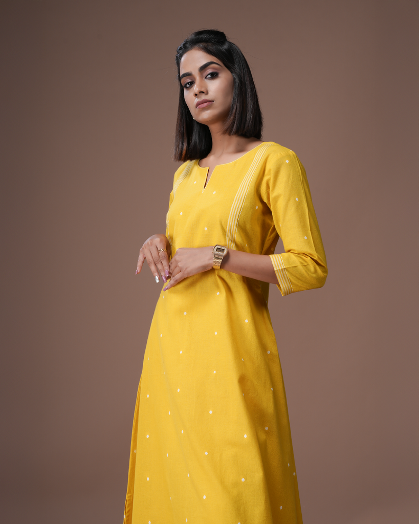 Anaya straight kurta in a soothing yellow hue, adorned with distinctive woven motifs. This elegant piece features three-fourth sleeves and stylish Close round neck button detailing from shoulder strap, making it an ideal choice for daily wear and office settings.