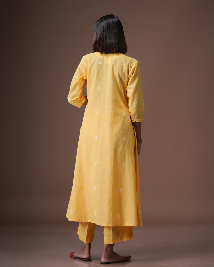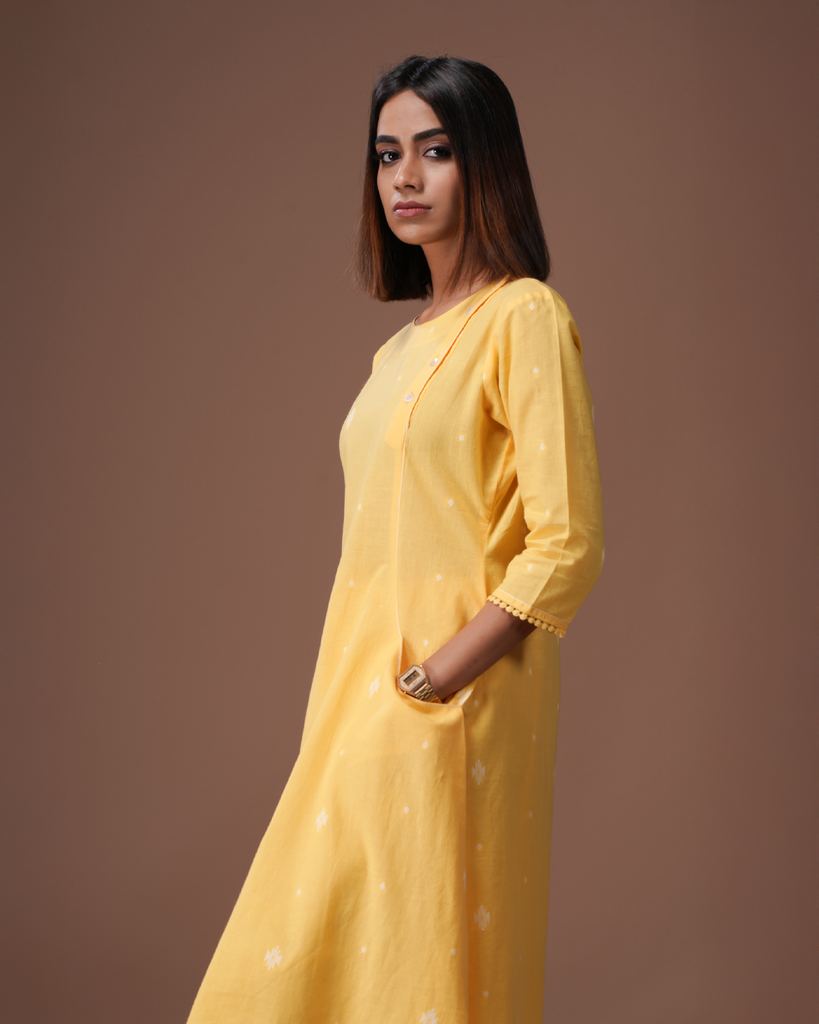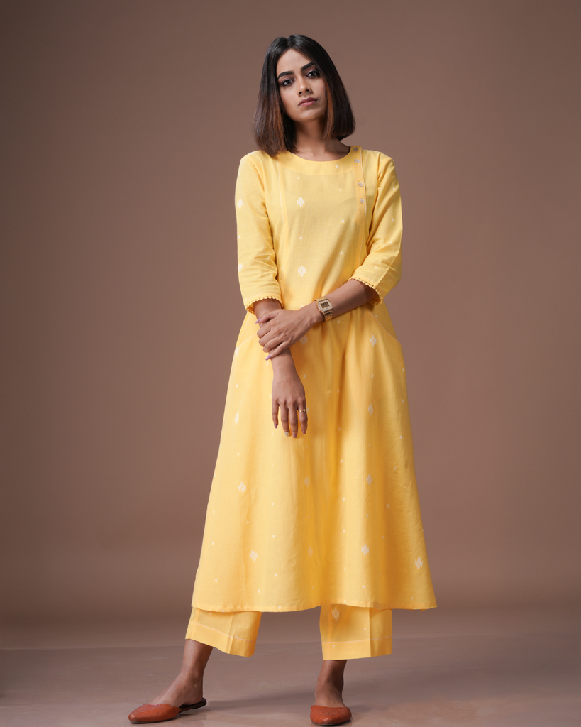 Anaya straight kurta in a soothing yellow hue, adorned with distinctive woven motifs. This elegant piece features three-fourth sleeves and stylish close round neck button detailing from shoulder straps, making it an ideal choice for both daily wear and office settings. Pair it with matching bottoms for a coordinated look