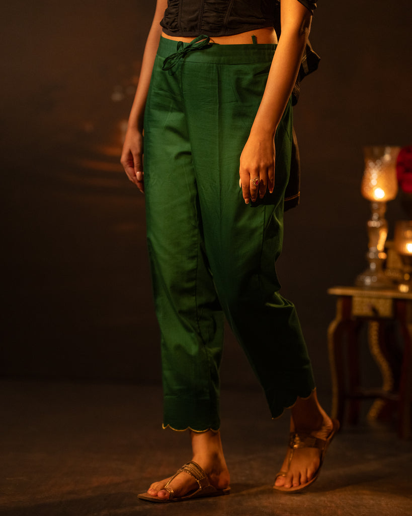 Bandhni parallel pants combine style and comfort with a drawstring closure for a customizable fit, a sleek front band, and a flexible back elastic. Also with gold zeri scallops, adding a touch of elegance to these versatile pants.