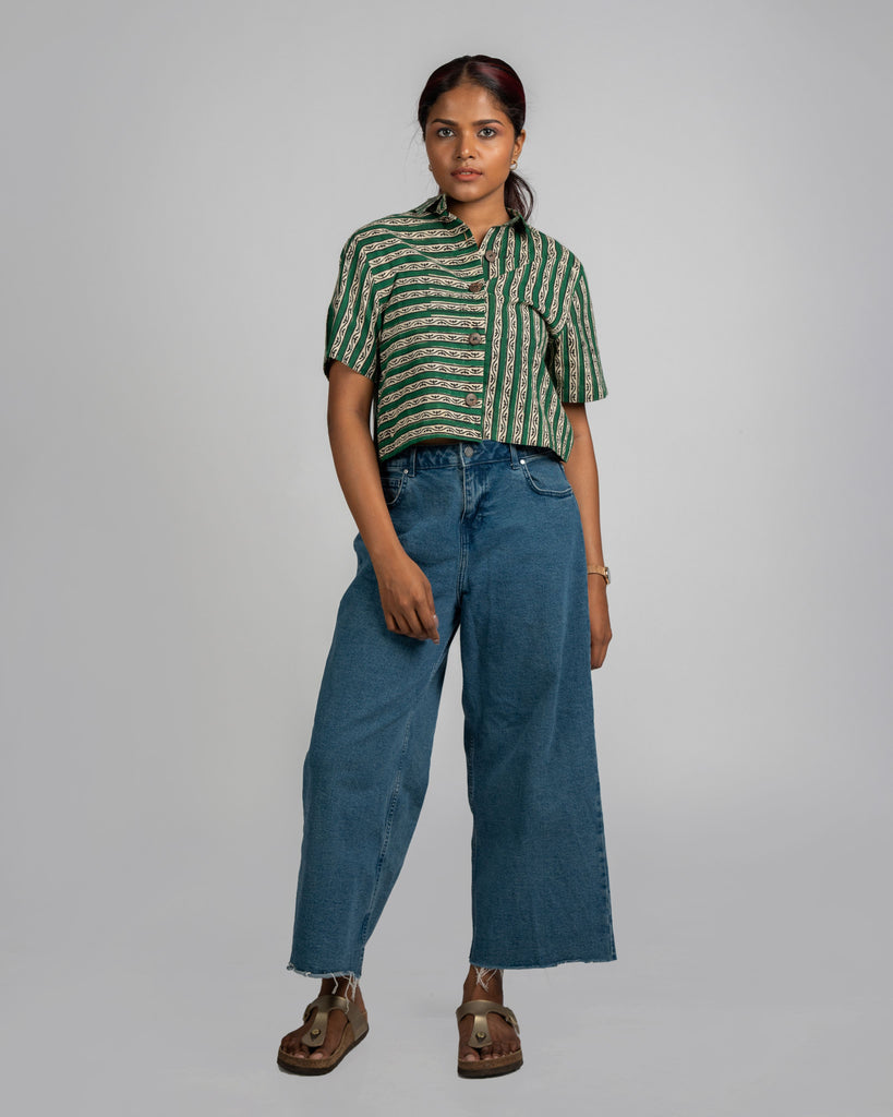 Green hand block printed crop shirt. Featuring a front-open design adorned with wooden buttons, a classic shirt collar, and half sleeves, it epitomizes effortless chic. The relaxed fit ensures comfort, while the hand-block print adds a touch of artisanal charm.