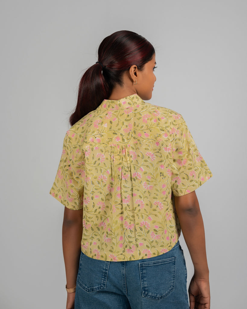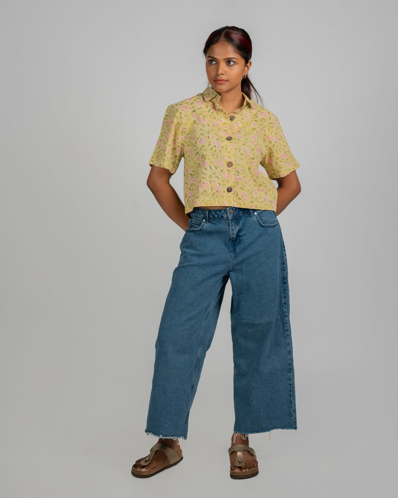 Lime Yellow Sanganeri Printed Crop Shirt, designed for the fashion-forward. Featuring a front open design with wooden buttons, shirt collar, and half sleeves, it offers a relaxed fit for effortless style. Adorned with vibrant Sanganeri prints, each piece is a celebration of artisanal craftsmanship and contemporary flair.