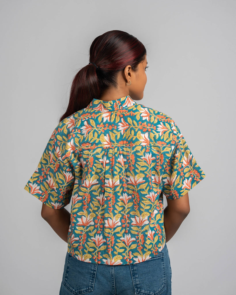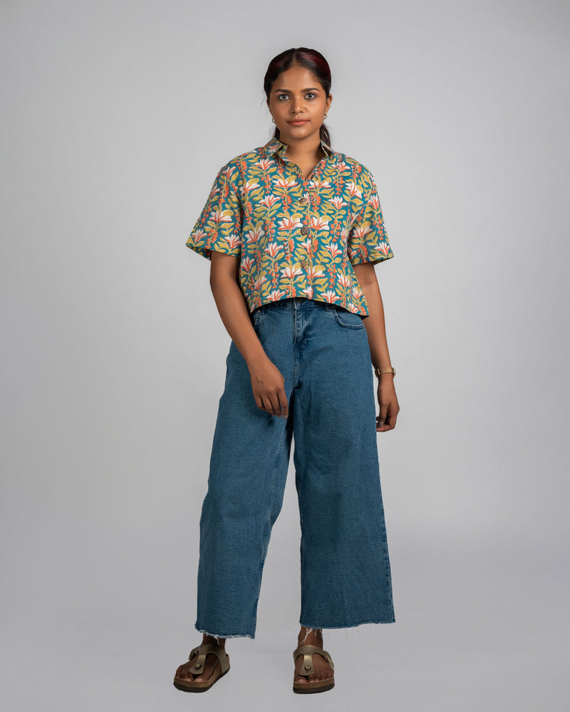 Teal Blue Hand-Block Printed Crop Shirt. Featuring a front-open design adorned with wooden buttons, a classic shirt collar, and half sleeves, it epitomizes effortless chic. The relaxed fit ensures comfort, while the hand-block print adds a touch of artisanal charm.
