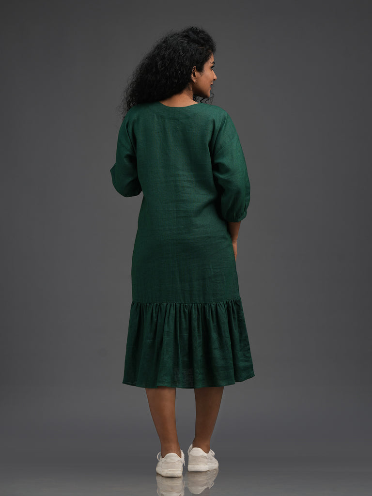 This 100% linen A-line dress offers a relaxed yet stylish silhouette with its high rounded neckline and V-cut detail. Designed with a loose fit, it features a drop waist style that adds a modern touch to its classic form. The 3/4th sleeves with gathered details and extended shoulders enhance the dress's effortless elegance. Side pockets provide practicality, while the drop waist gather effect on the hemline adds a subtle flair. Style it with strappy sandals and a wide-brimmed hat for a laid-back look, or pair it with ankle boots and a statement belt for a chic, contemporary ensemble.