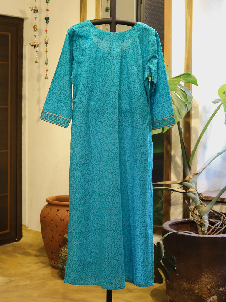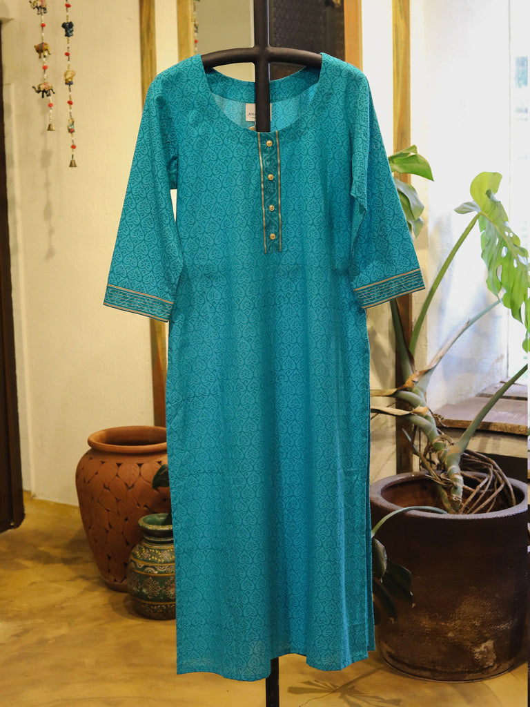 Turquoise Blue Hand Block Printed Straight Cut Kurta
