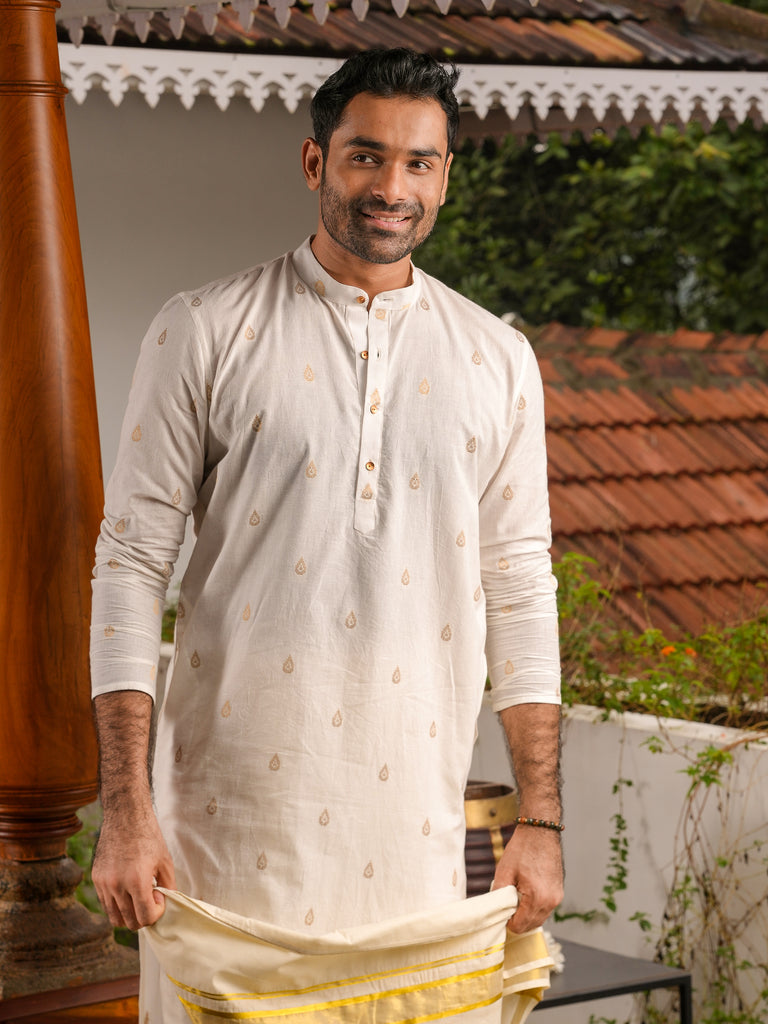 Discover refined elegance with our Off-White Onam Men's Kurta, adorned with intricate golden leaf motifs. Featuring a mandarin collar, front placket with gold buttons, full sleeves, and side pockets, this kurta is a perfect blend of classic style and artistic flair, ideal for those who value a timeless yet distinctive look.