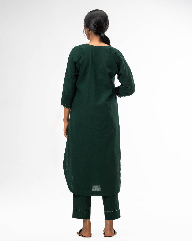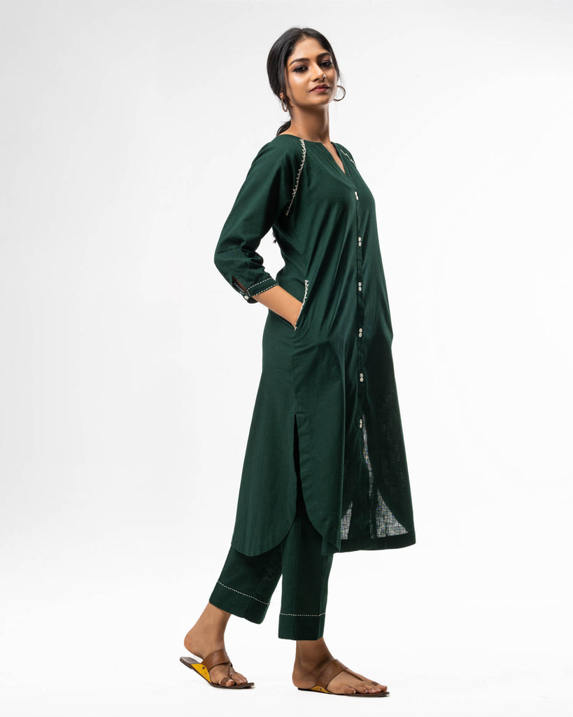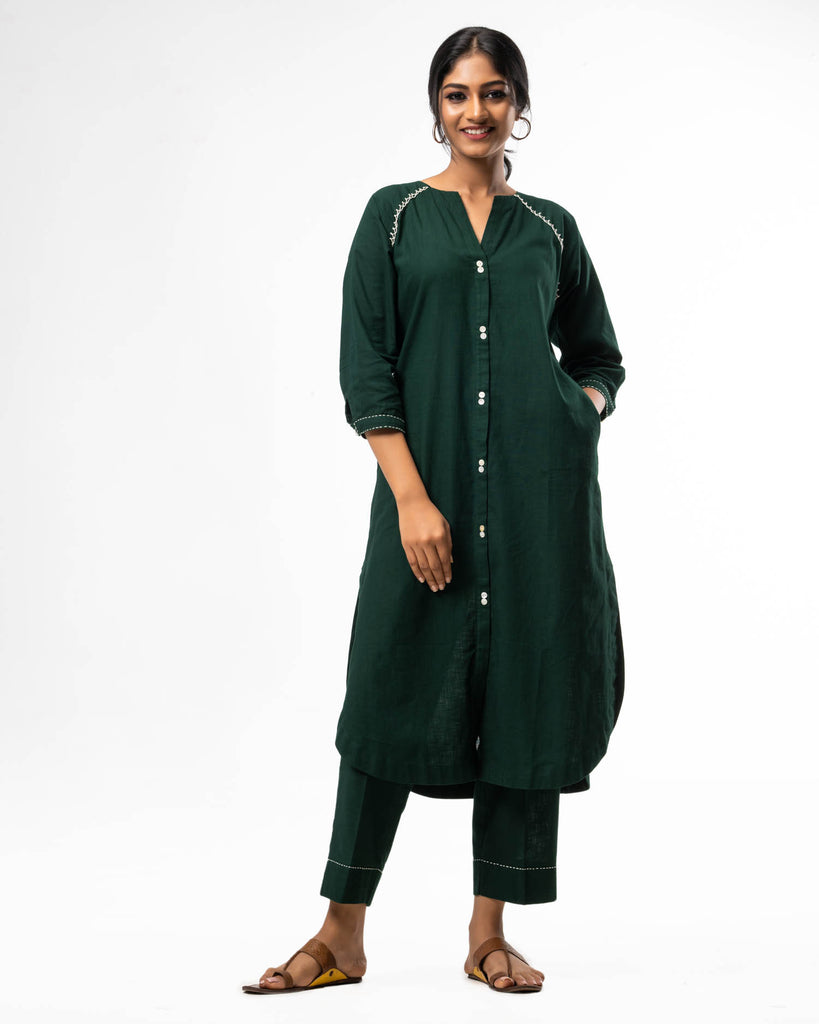 Elevate your style with our Forest Green A-Line Kurta, featuring raglan sleeves adorned with loop and button details. The close neck with a placket and shell button accents adds a sophisticated touch. Practical side pockets, a curved hemline, and side slits ensure comfort and ease of movement. Intricate hand kantha detailing embellishes the neck, sleeves, and pockets, making this kurta a perfect blend of elegance and artisanal craftsmanship.