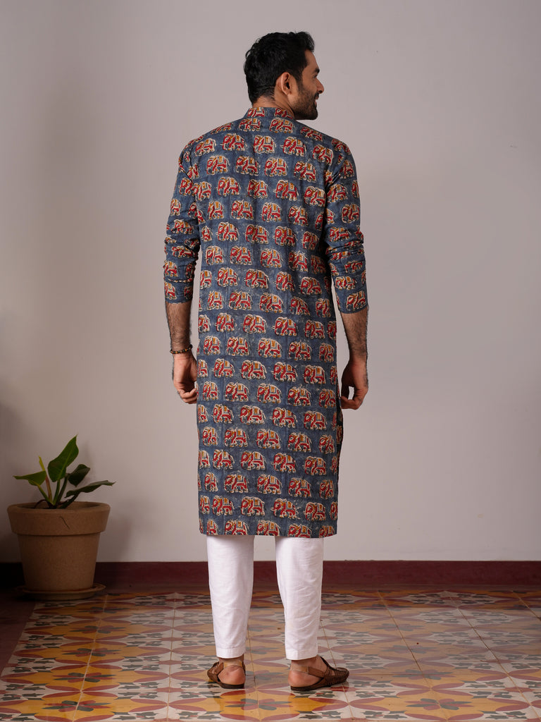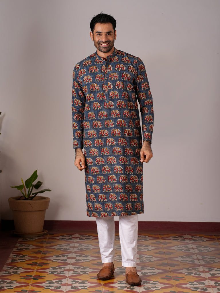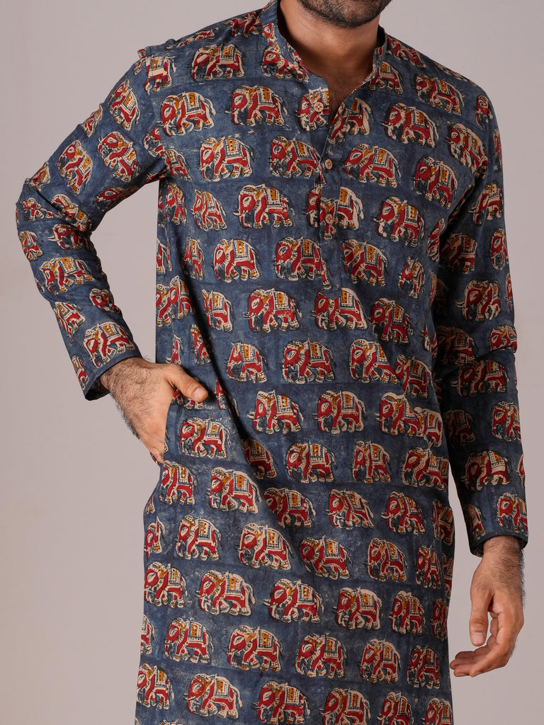 Stand out with our Turquoise Blue Kalamkari Floral Men’s Kurta, featuring intricate hand-printed floral motifs in vibrant hues. The striking turquoise blue color is perfectly complemented by the detailed Kalamkari designs, offering a fusion of traditional artistry and modern sophistication. This kurta is crafted with a mandarin collar, front button placket, full sleeves, and side pockets, providing both style and comfort. Ideal for festive occasions or casual gatherings, this kurta adds a touch of elegance and cultural richness to your wardrobe.