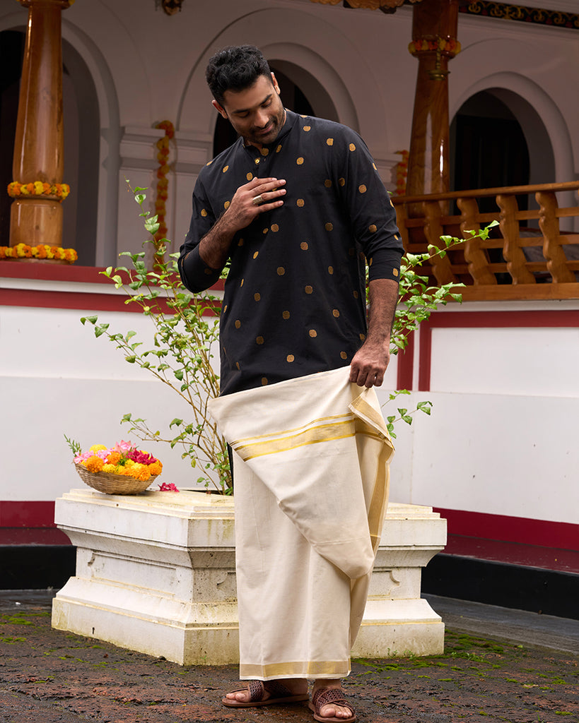 Make a statement this Onam! Our striking black men's kurta features eye-catching golden polka dots, a mandarin collar, and gold buttons. Perfect for a refined, festive look.