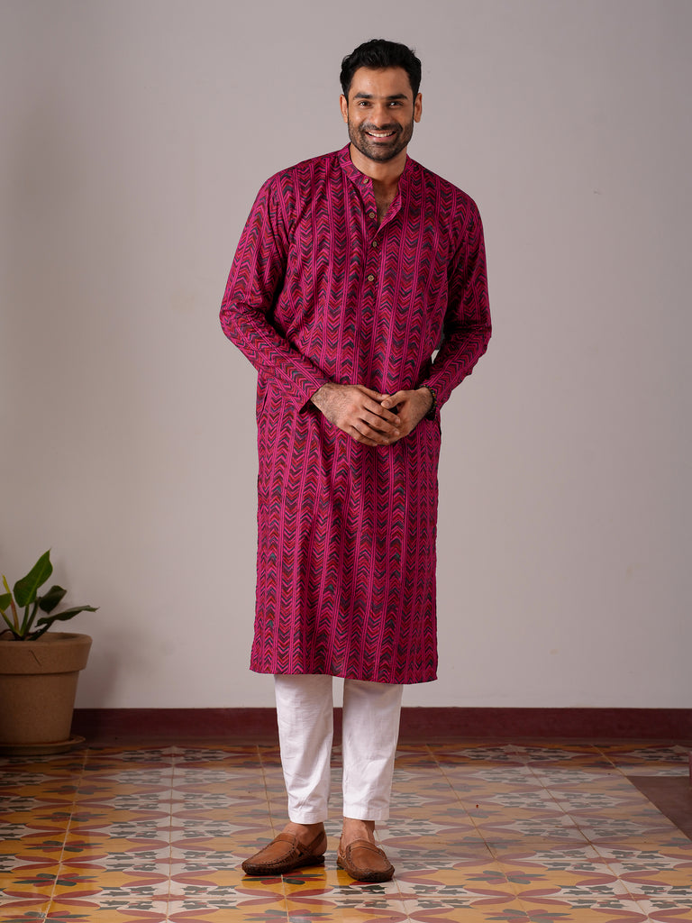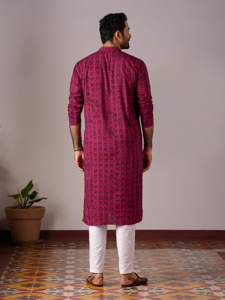Elevate your style with our Magenta Kalamkari Men’s Kurta, showcasing traditional Kalamkari print in vibrant hues. The rich magenta color is complemented by intricate detailing, creating a perfect blend of cultural heritage and modern elegance. Designed with a comfortable fit, this kurta features a mandarin collar, front button placket, full sleeves, and side pockets. Ideal for festive occasions or casual gatherings, this kurta embodies timeless sophistication with a touch of artistic flair.