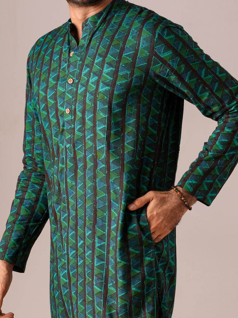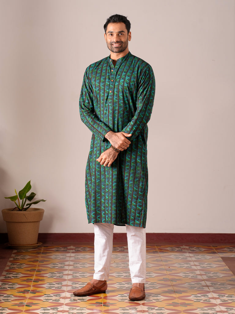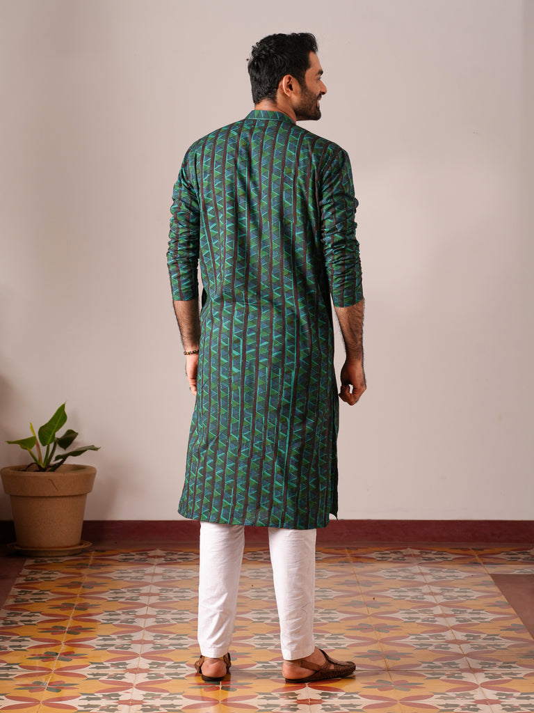Stand out with our Turquoise Blue Kalamkari Floral Men’s Kurta, featuring intricate hand-printed floral motifs in vibrant hues. The striking turquoise blue color is perfectly complemented by the detailed Kalamkari designs, offering a fusion of traditional artistry and modern sophistication. This kurta is crafted with a mandarin collar, front button placket, full sleeves, and side pockets, providing both style and comfort. Ideal for festive occasions or casual gatherings, this kurta adds a touch of elegance and cultural richness to your wardrobe.