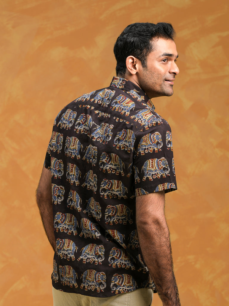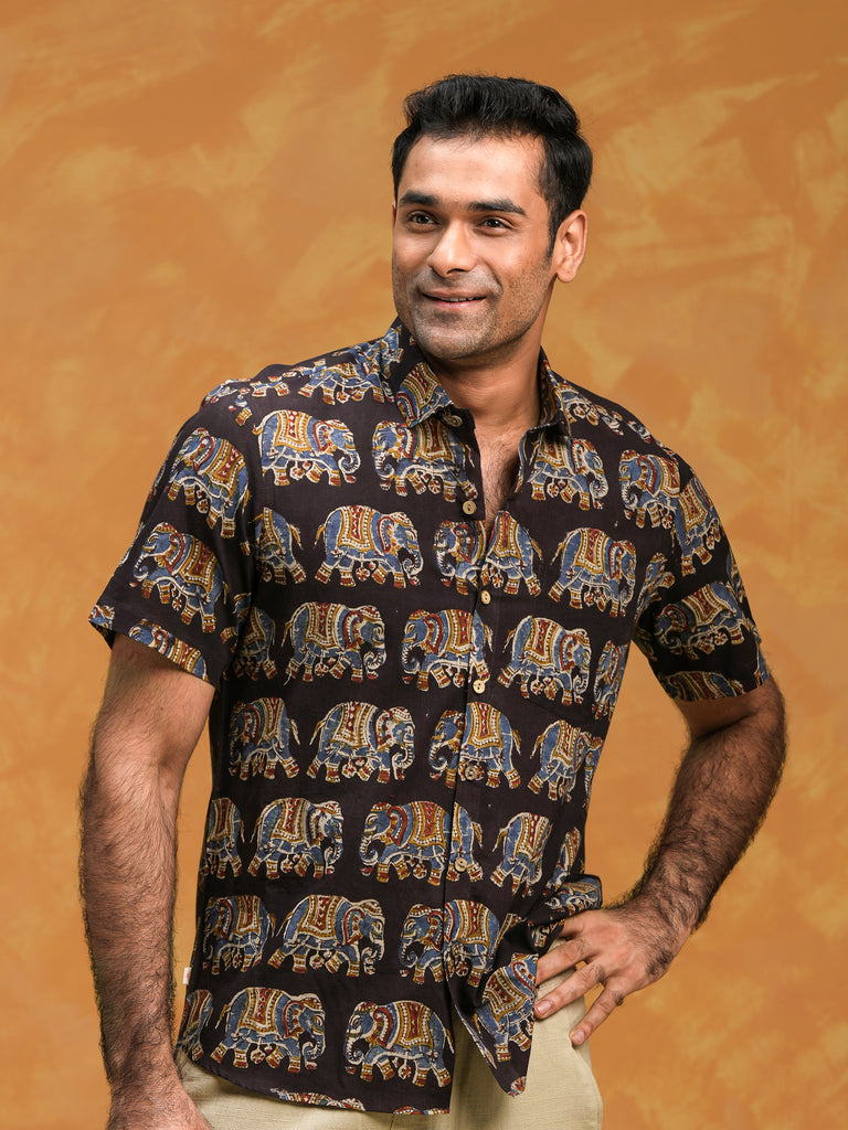 Hand-printed on breathable cotton, this regular fit shirt features intricate elephant motifs and classic wooden buttons, combining comfort and timeless style.