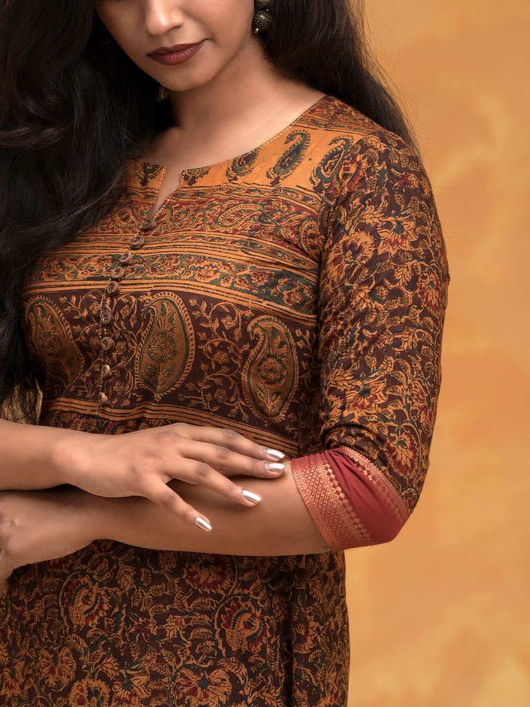 Featuring a combination of mustard yellow and brown floral Kalamkari designs. The front yoke showcases horizontal Kalamkari borders, with the kurta neck highlighted by zari lines and wooden button detailing. This A-line kurta with low side slits includes 3/4th sleeves with contrasting Nizam borders and convenient side pockets.