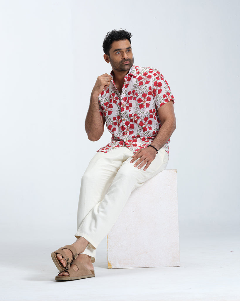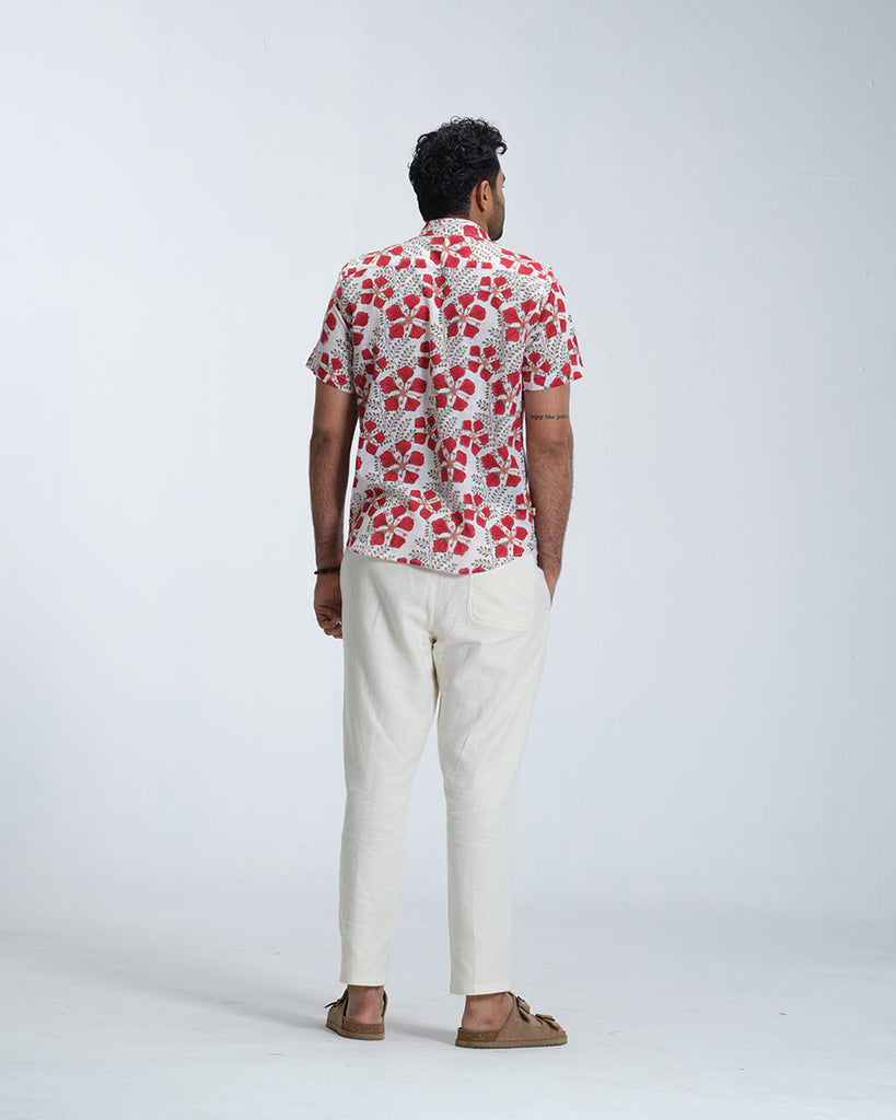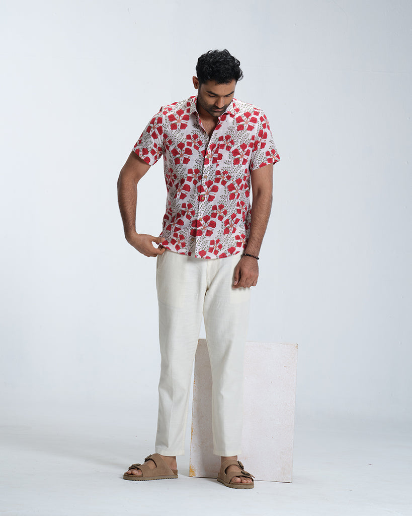White and Red Gulmohar Printed Men’s Shirt captures the vibrant charm of Kerala’s streets lined with blooming Gulmohar trees. Made from soft, breathable cotton, this half-sleeve shirt combines comfort with a lively touch of tradition.