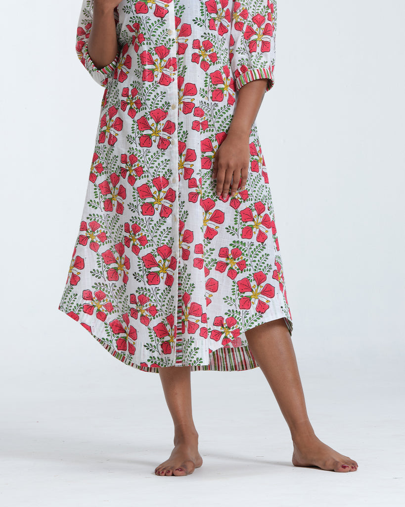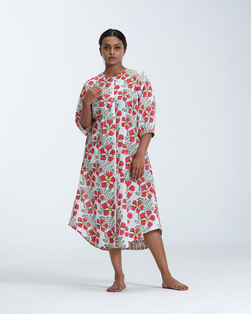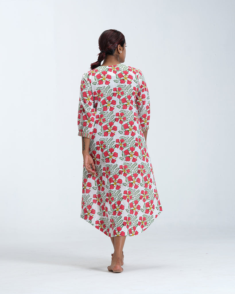 White Gulmohar Printed Maxi Dress blends comfort with understated style. Designed with a front button opening and practical side pockets, it offers ease and versatility for everyday wear. The soft Gulmohar print in soothing hues adds a touch of freshness, making this dress a perfect choice for effortless, all-day comfort.