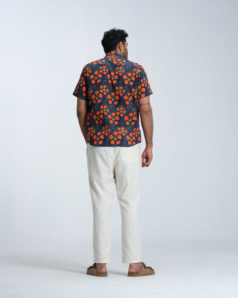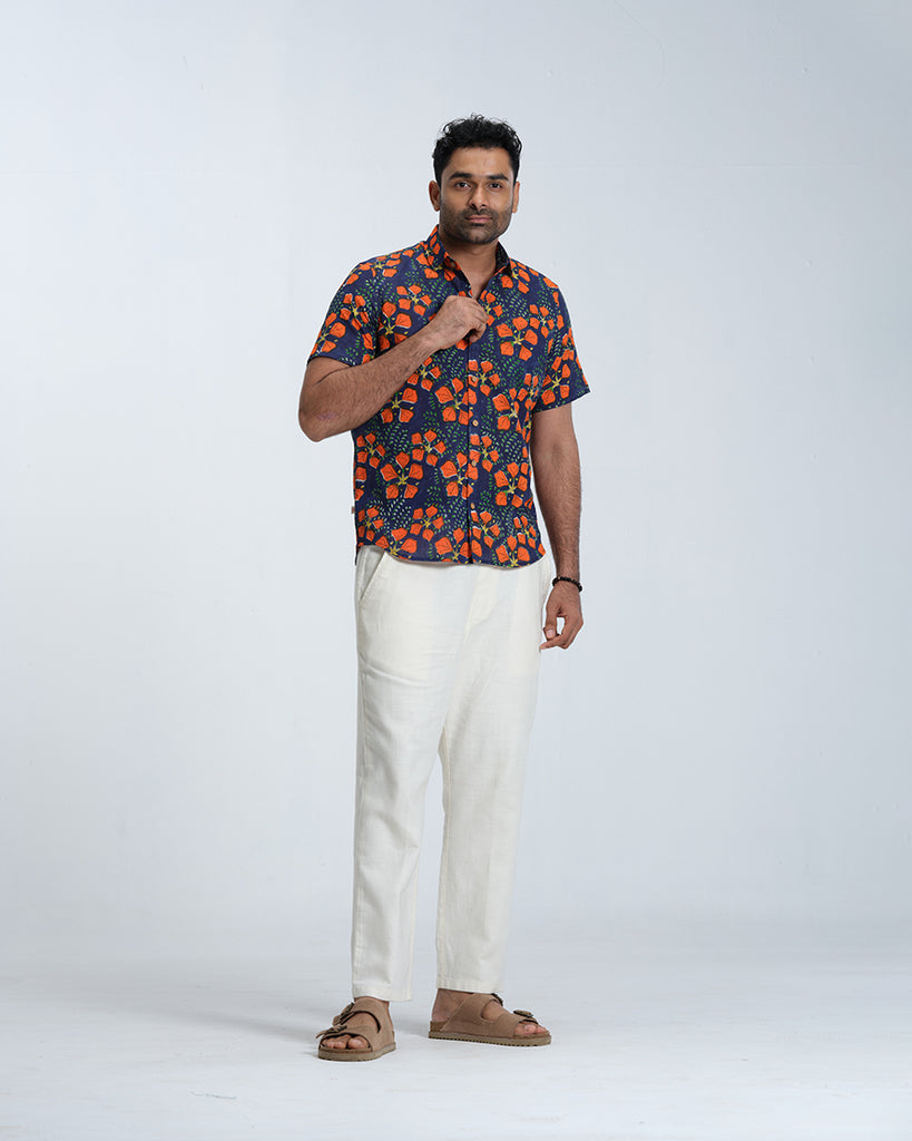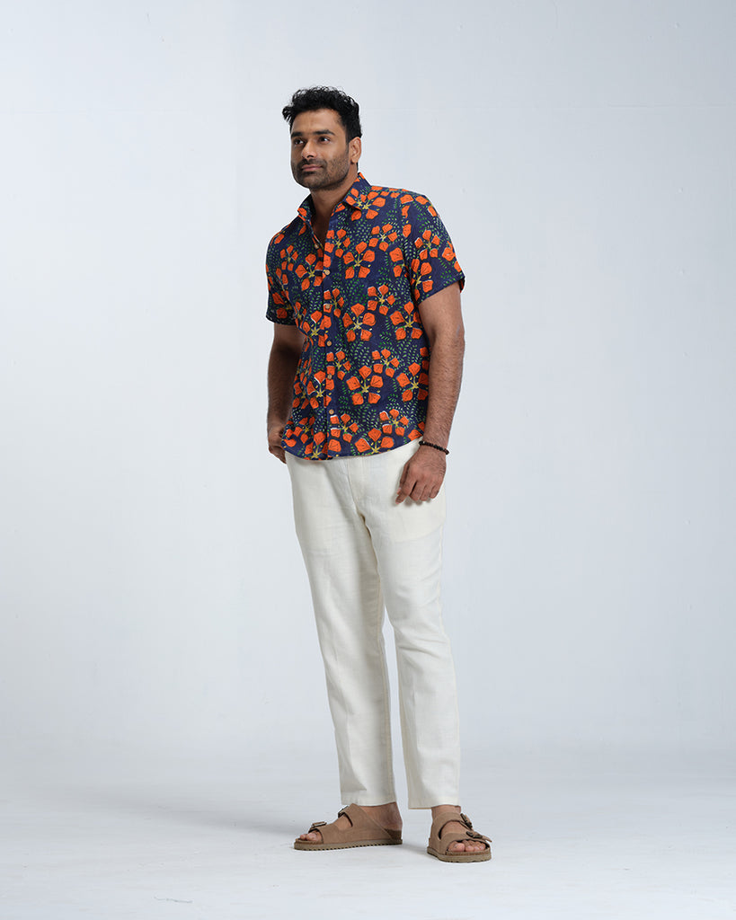 Blue and Orange Gulmohar Printed Men’s Shirt captures the vibrant charm of Kerala’s streets lined with blooming Gulmohar trees. Made from soft, breathable cotton, this half-sleeve shirt combines comfort with a lively touch of tradition.