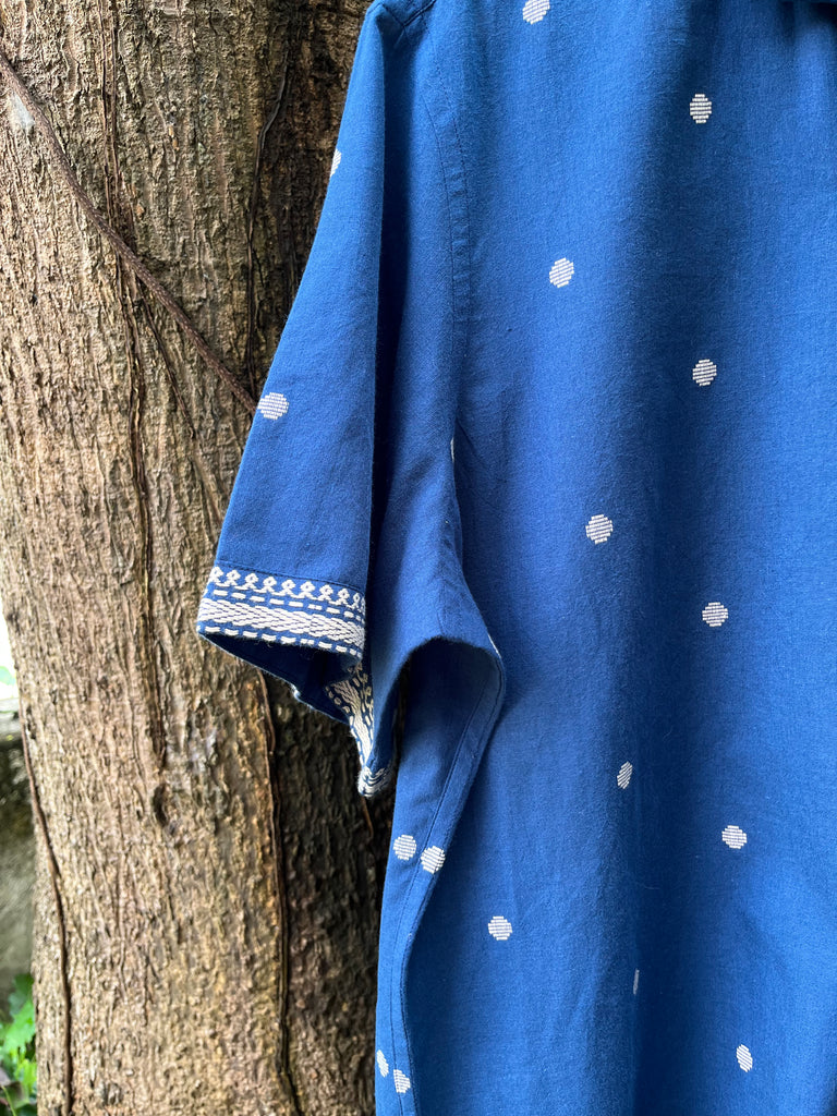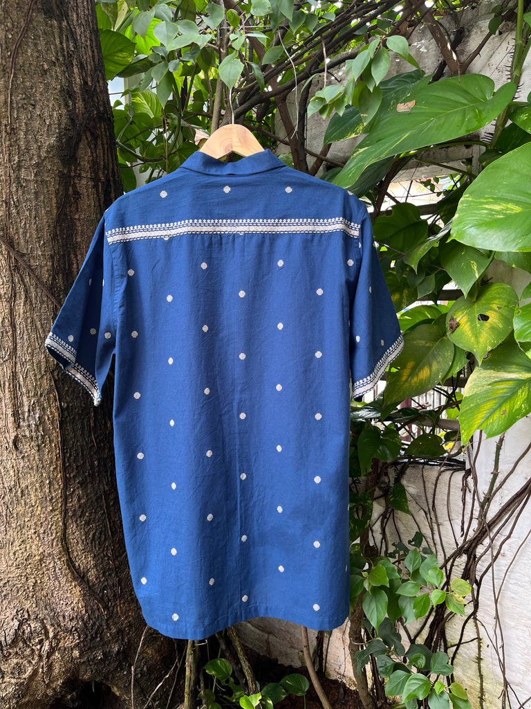 Discover effortless cool with this oversized blue South Cotton men's shirt. The vibrant fabric is adorned with delicate contrast butti weaving, creating a unique texture. Designed for a relaxed fit, it features a trendy Cuban collar and comfortable half-sleeves. Intricate border detailing on the front placket, sleeves, and back yoke adds a touch of artisan charm. With a clean, straight-cut hem, a classic back yoke, and natural wooden buttons.