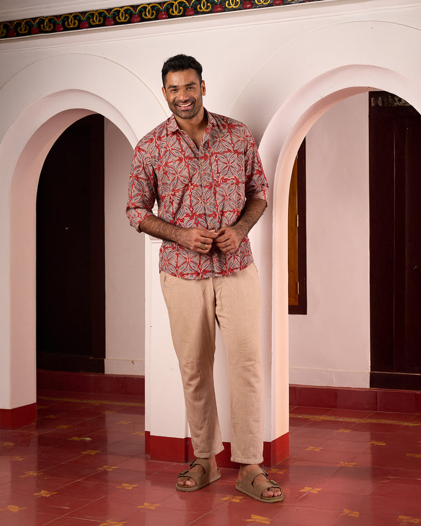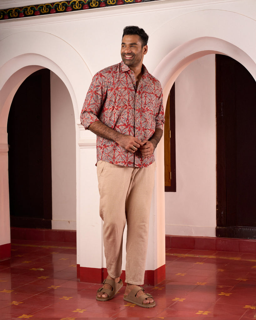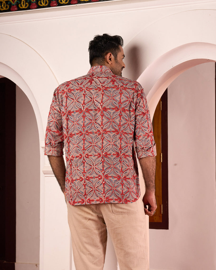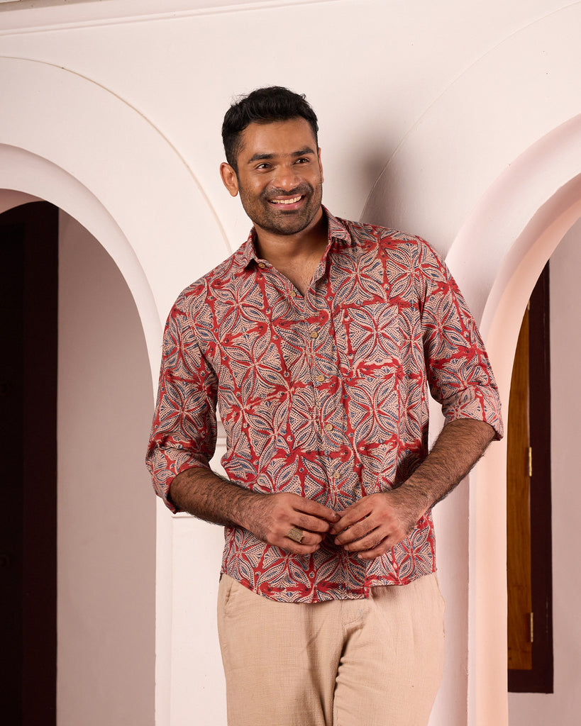 Infuse your wardrobe with colors, our full-sleeve Kalamkari shirt features  hand-printed pattern in a vibrant red and blue. Made from soft, breathable cotton and designed for a regular fit, it's a perfect blend of artistic tradition and modern comfort, complete with natural wooden buttons.