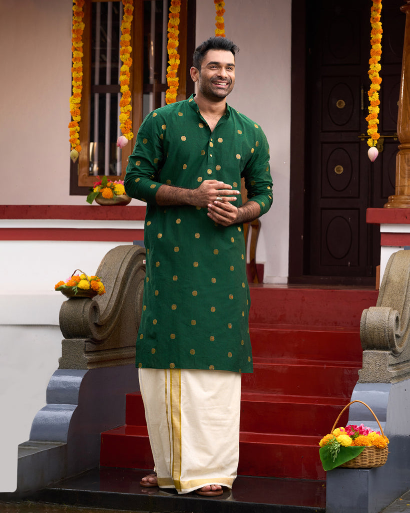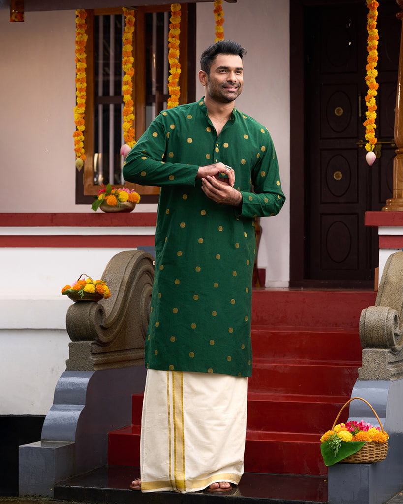 Step into Onam with a fresh look! Discover our bottle green short kurta adorned with unique golden polka dots, a sharp mandarin collar, and gold buttons. Timeless flair, shorter length.