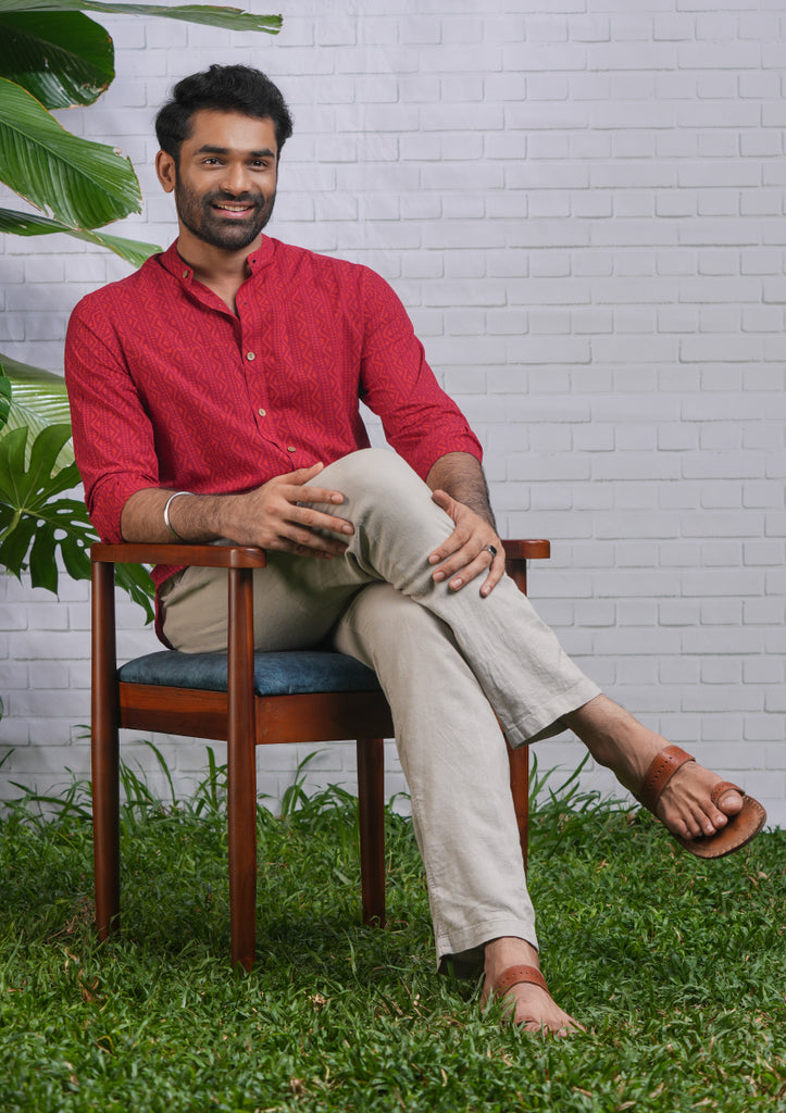 Handblocked red striped cotton shirt and full sleeves.