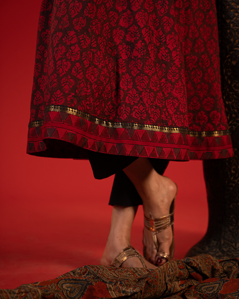 This red and maroon princess-cut kurta features elegant jaal print designs. It has a straight V-neckline with contrast Nizam borders on the neck, sleeves, and hem. The 3/4th sleeves and hemline are highlighted with matching borders, and side pockets add practicality.