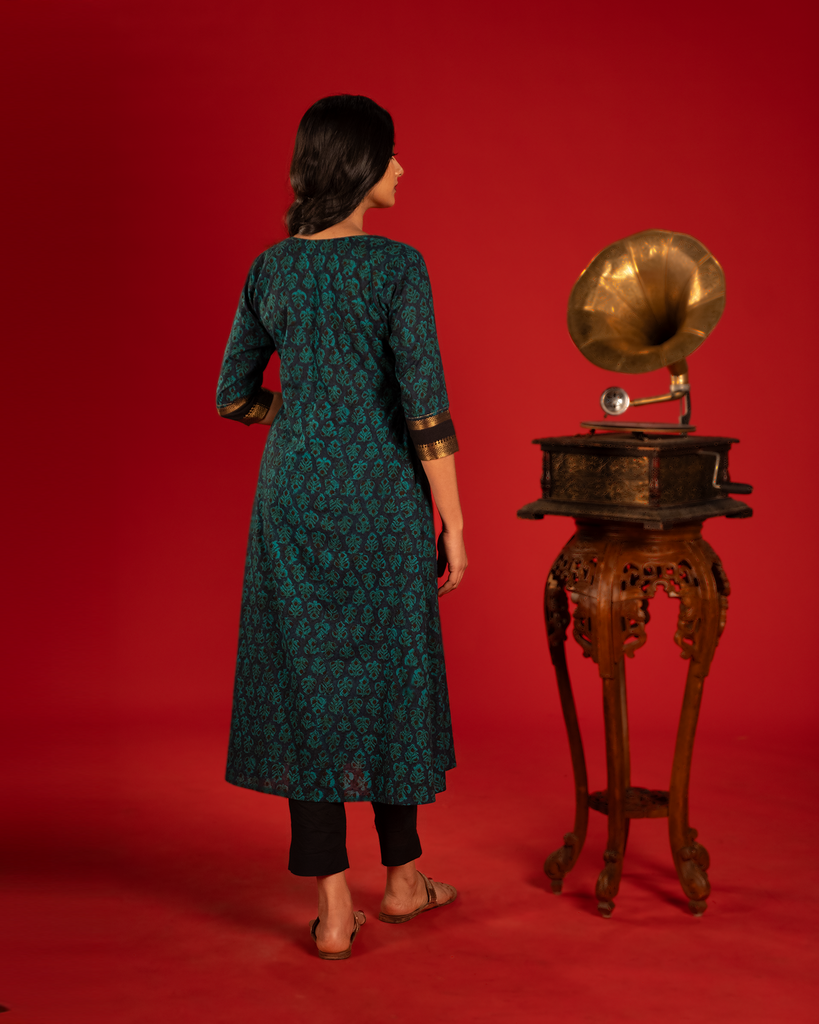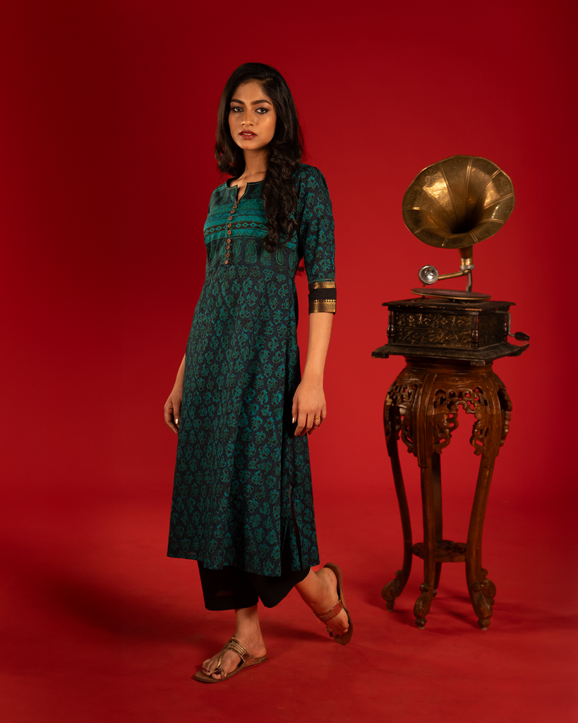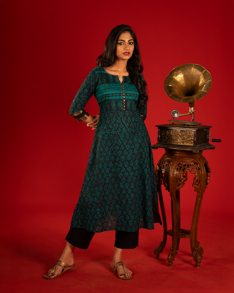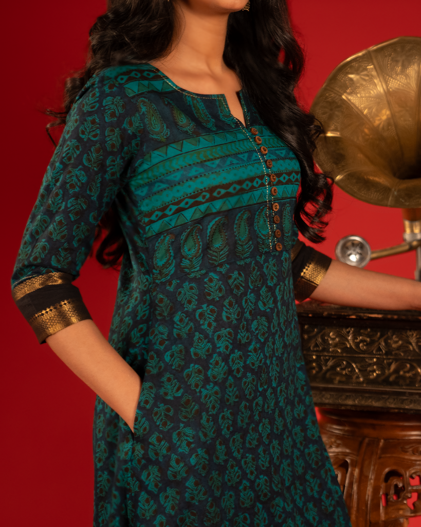 Peacock blue A-line kurta having small kalamkari butti designs. The front yoke features horizontal kalamkari borders, and the neckline is accented with zari lines and wooden buttons. It has 3/4th sleeves with contrasting nizam borders, low slits on both sides, and side pockets for convenience.