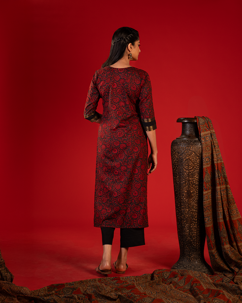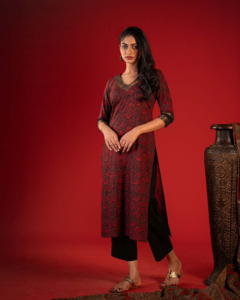 This dark maroon straight-cut kurta features elegant Kalamkari jaal prints. It has a wide V-neck with Nizam borders, 3/4th sleeves with contrasting Nizam borders, and zari highlights on the neck and sleeves. The side slits add a stylish touch to its design.