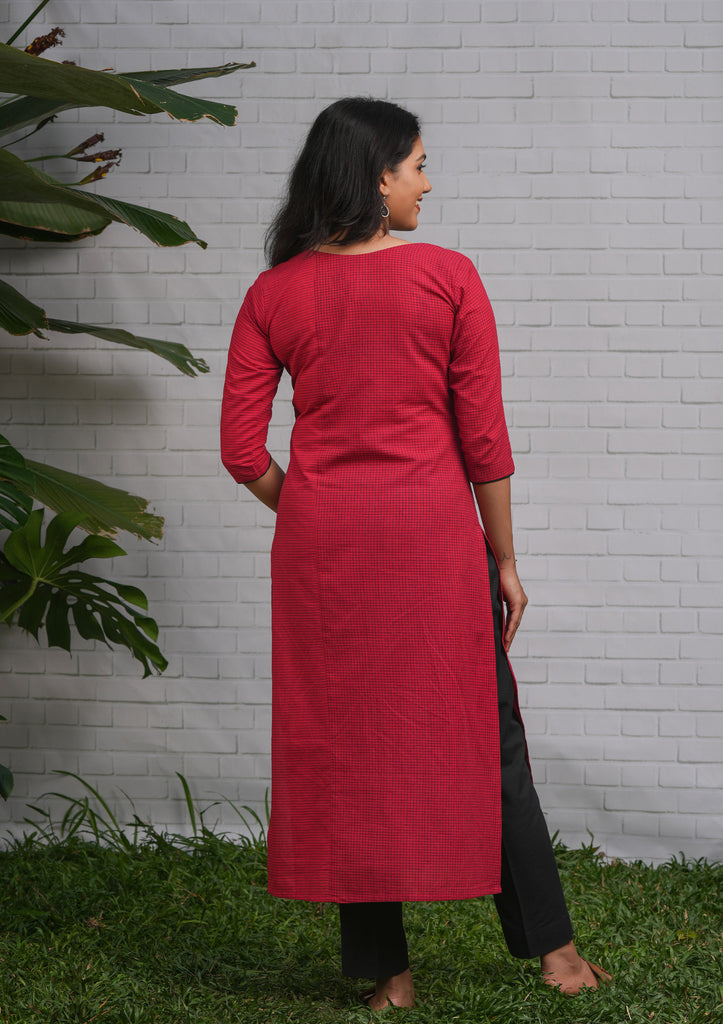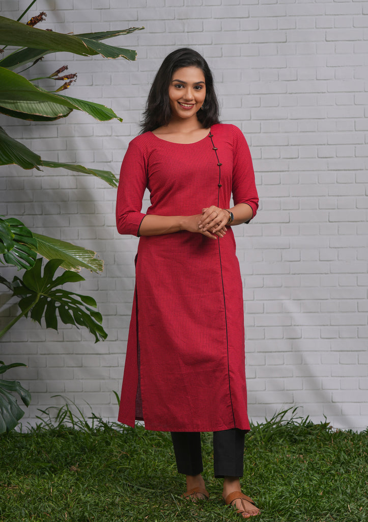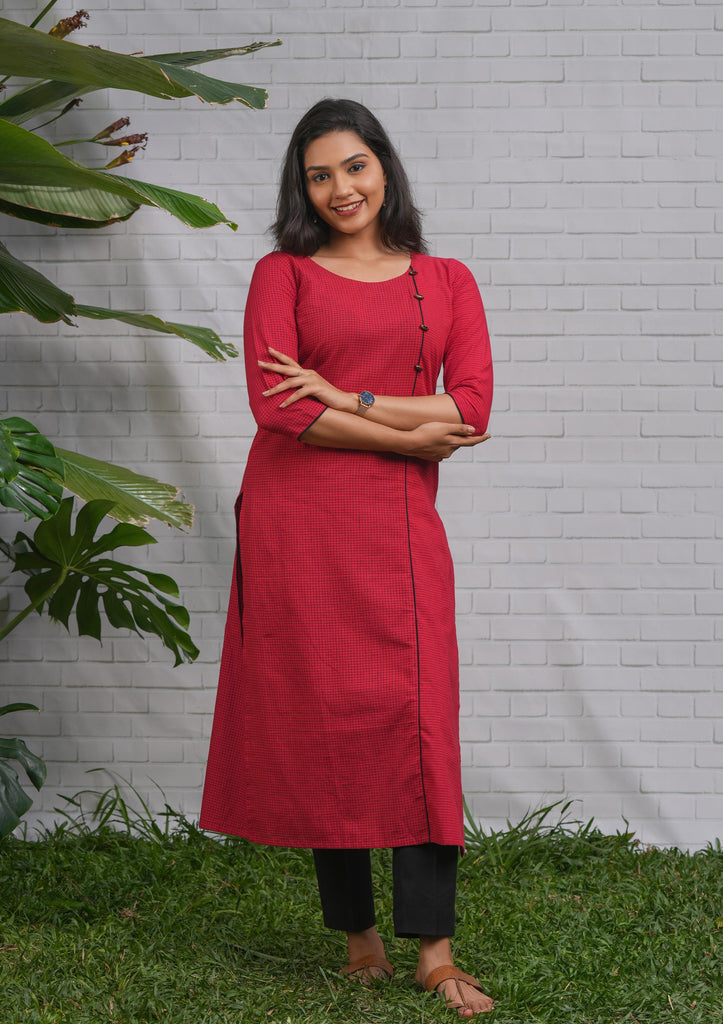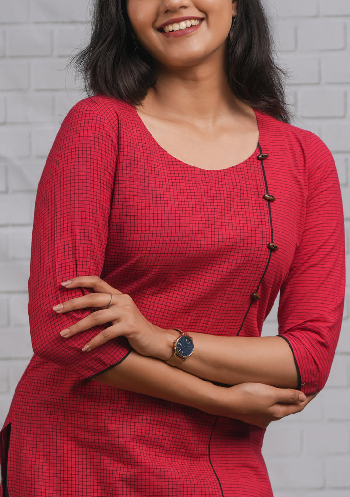 Red checkered straight cut kurthi with black piping and wooden button detailing.