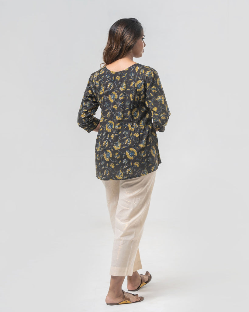 Black & Olive Green Floral Hand Block Printed Top: a striking blend of colors and craftsmanship. This top features a curved "V" neck, 3/4 sleeves adorned with golden zari stitch lines, and a side yoke enhanced with delicate pintucks. The side gathers provide extra ease, and a side slit ensures superior comfort.