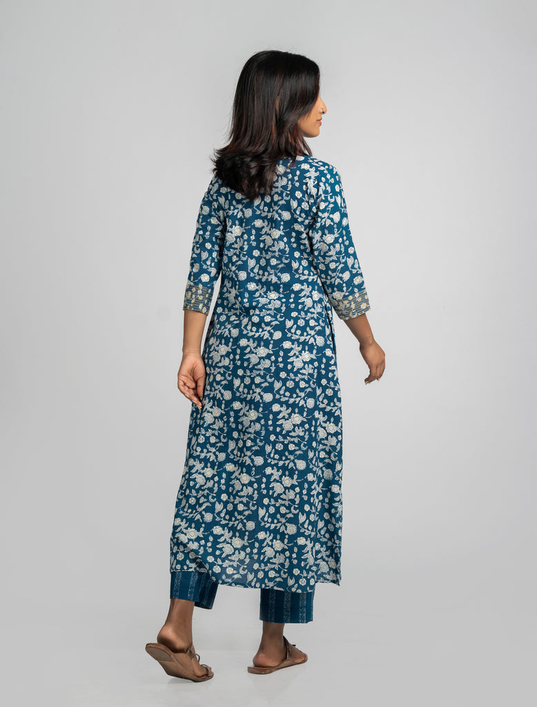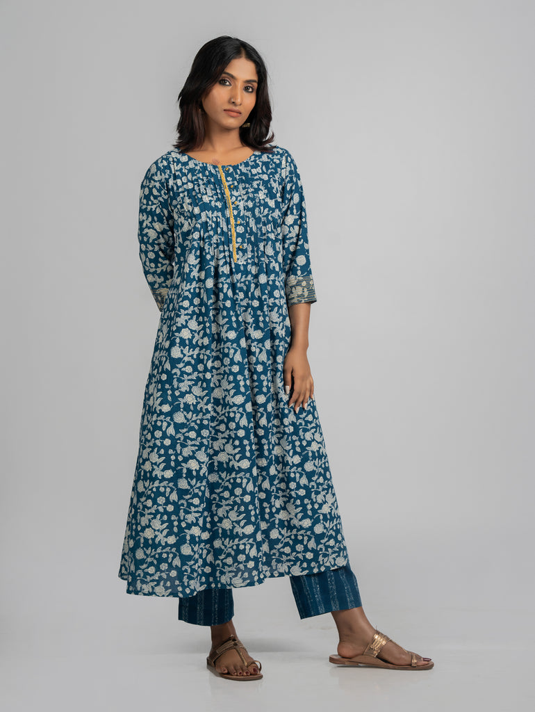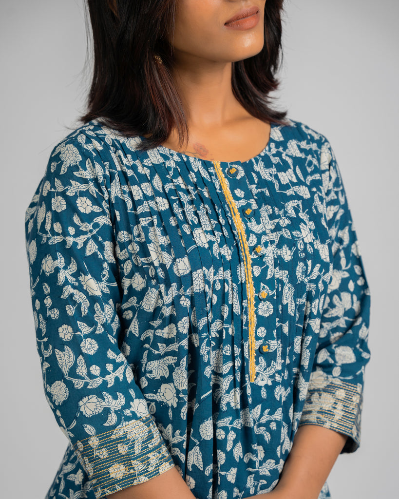 Delight in the elegance of our hand-blocked Indigo Kurthi, adorned with a delicate floral jaal print. This garment features a semi-round neck enhanced by an embroidered placket and front opening accented with ornately embroidered buttons. Pleated tucks on the yoke ensure added ease at the front, offering a flattering fit. The 3/4th sleeves are embellished with a striking yellow and gold combo running stitch, adding a touch of sophistication. This A-line kurta is designed for functionality and style, equipped with convenient pockets and subtle side slits. Pair it with matching pants to complete a seamless and stylish ensemble.