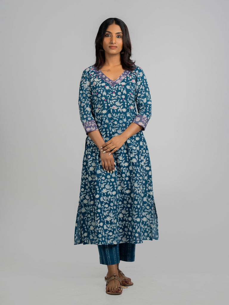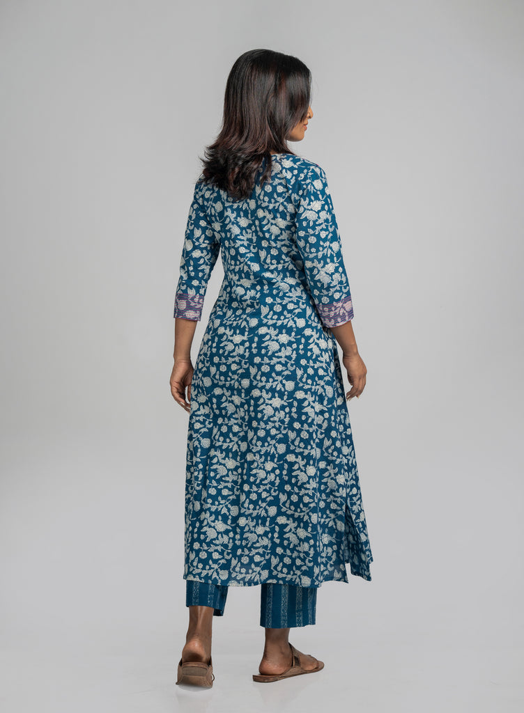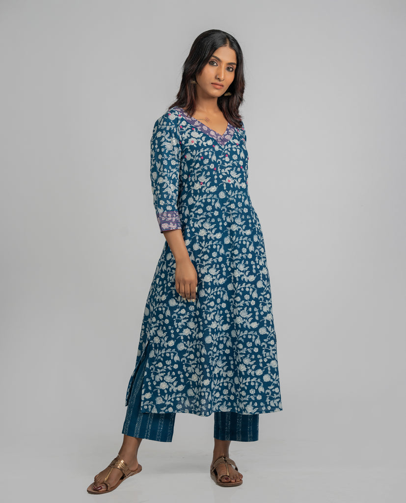 Dive into the elegance of our A-line Kurta, crafted from exquisite hand-blocked indigo fabric adorned with a delicate small floral jaal print. This kurta is uniquely designed with a low front slit that adds a modern twist to its traditional silhouette. The curved 'V' neck is intricately detailed with a running stitch, complementing the hand embroidery on the front yoke. The 3/4th sleeves are beautifully highlighted with a pink and gold combo running stitch, enhancing the garment’s artisanal appeal. Side pockets add a practical touch to this stylish piece. Complete your look with matching pants and effortlessly redefine your style.