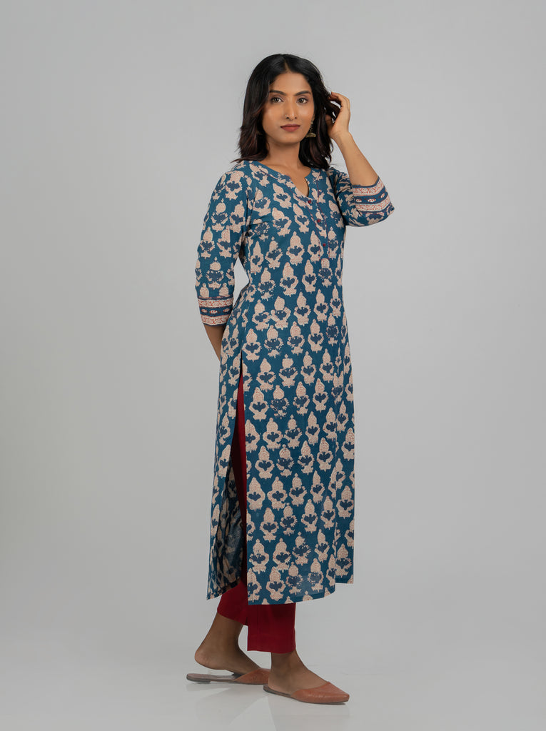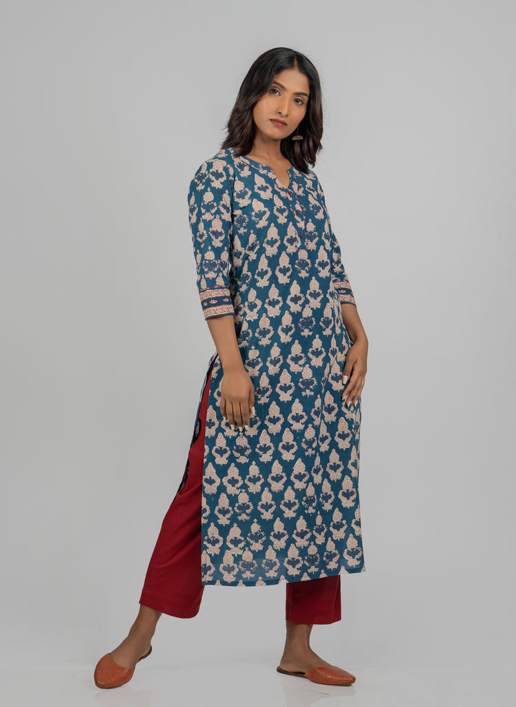 Elevate your wardrobe with our straight-cut Kurta, expertly crafted from hand-blocked indigo fabric adorned with distinctive motifs. The design features a patterned neckline with a front open style, highlighted by elegant embroidery buttons along the placket for a refined touch. The 3/4th sleeves are complemented by matching border detailing on the hem, adding cohesion and style. Pair this kurta with contrasting pants to complete a sophisticated ensemble that redefines your style effortlessly.