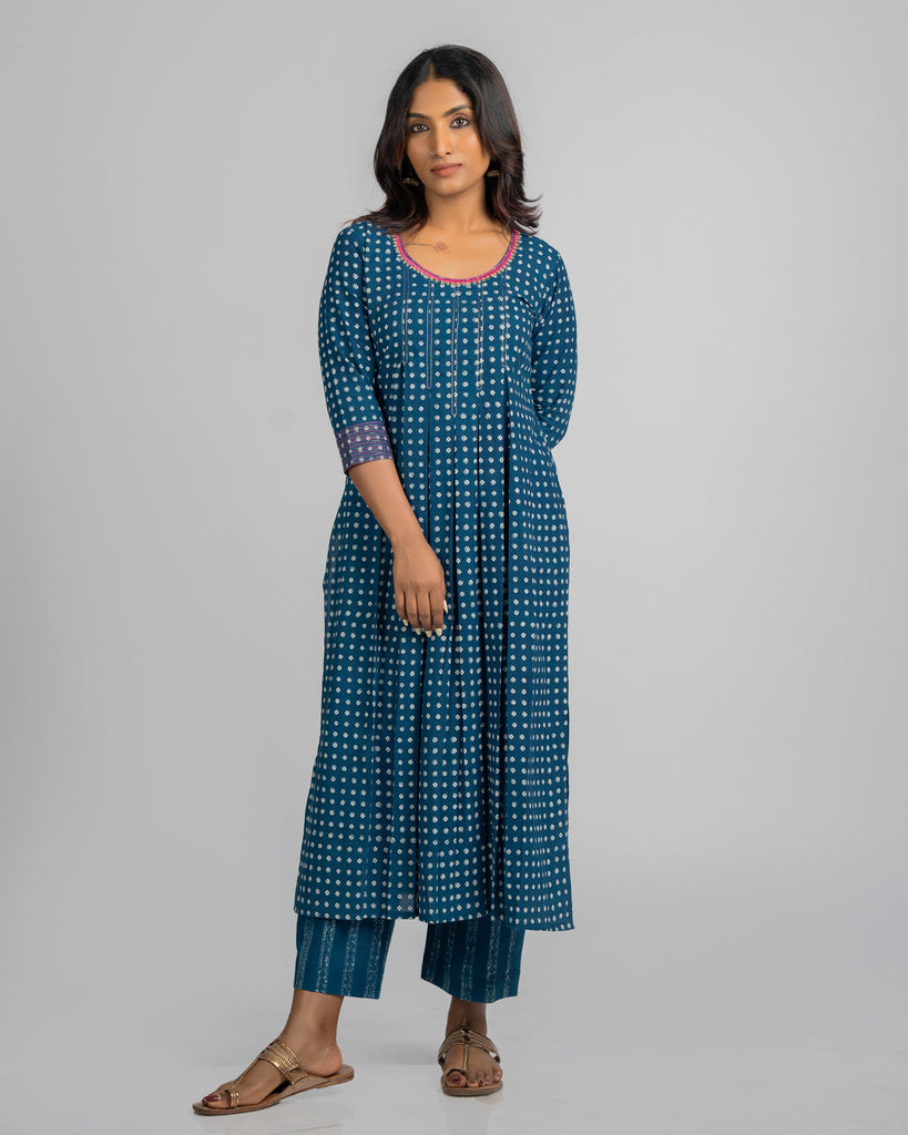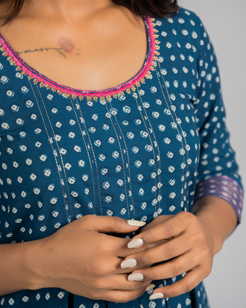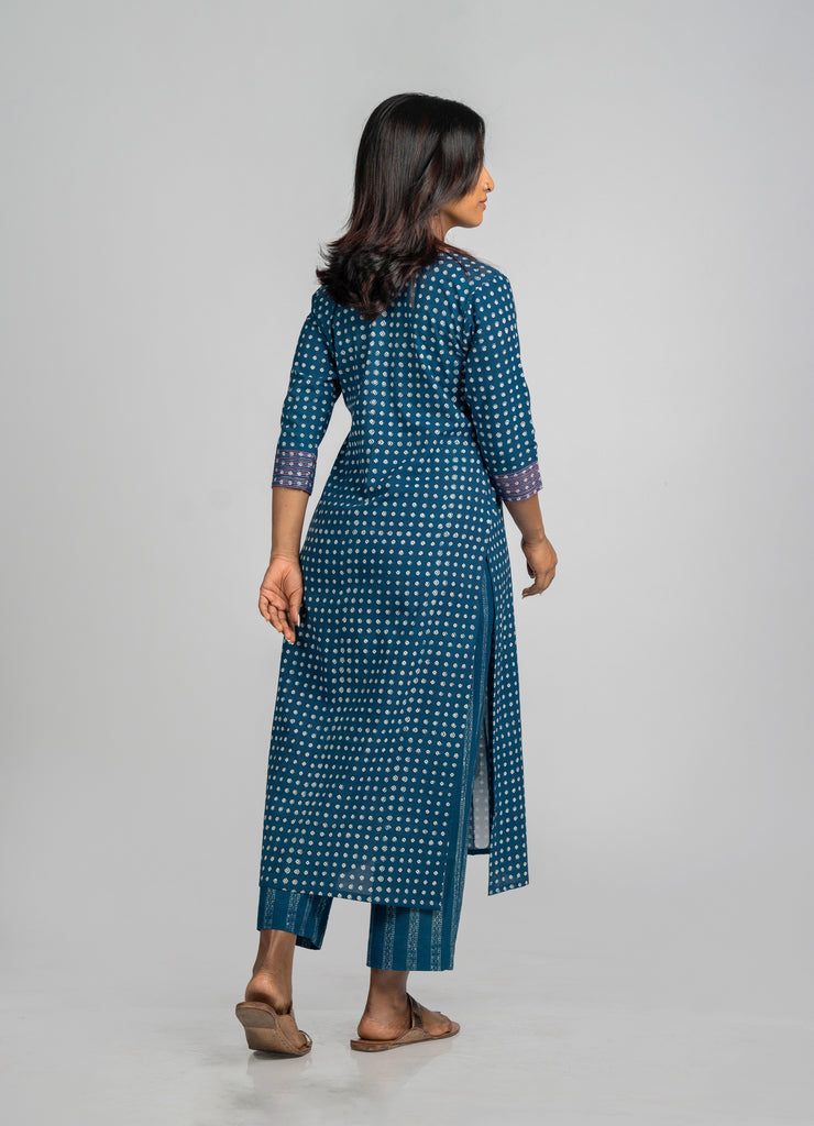 Embrace traditional elegance with our straight-cut Kurta, crafted from hand-blocked indigo fabric featuring small butti prints. This piece is highlighted by an inverted box pleat adorned with antique gold zari, adding a luxurious touch. The round neck is beautifully framed with contrasting thread and detailed with antique gold zari embroidery, enhancing its classic appeal. The 3/4th sleeves are embellished with a pink and gold combo running stitch, providing a pop of color and intricate detail. Pair this kurta with matching pants to complete a cohesive and stylish look.