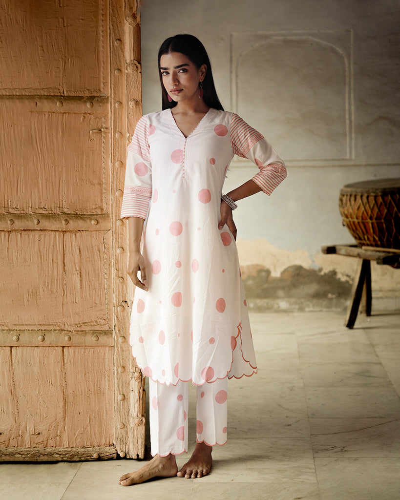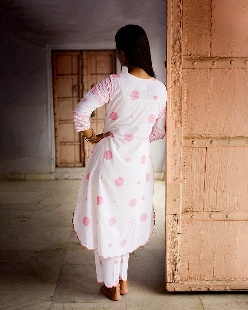 Add a pop of color to your wardrobe with our charming pink polka dot A-line kurta co-ord set. The kurta features a flattering V-neck with delicate piping, 3/4th sleeves with patterned border lines, and a curved hemline adorned with matching thread scallop detailing. It includes side pockets and side slits for extra ease, and comes complete with a slip. The set is rounded off with comfortable parallel bottoms, also featuring matching thread scallop detailing, a drawstring front, and an elastic back for a perfect fit.
