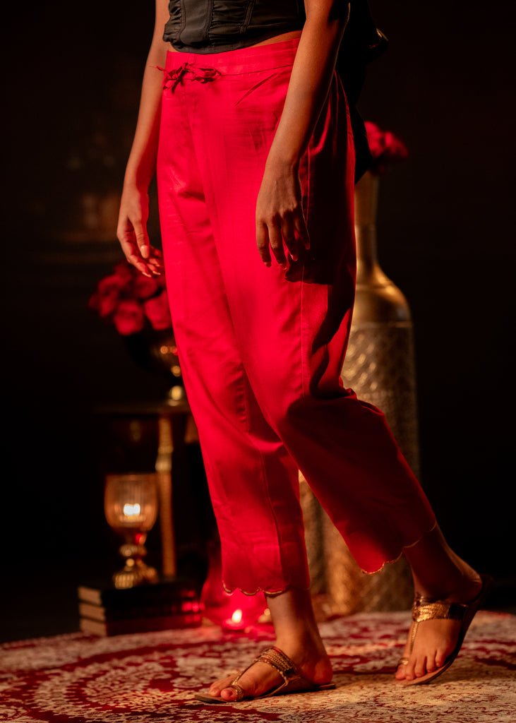 Bandhni parallel pants combine style and comfort with a drawstring closure for a customizable fit, a sleek front band, and a flexible back elastic. Also with gold zeri scallops, adding a touch of elegance to these versatile pants.