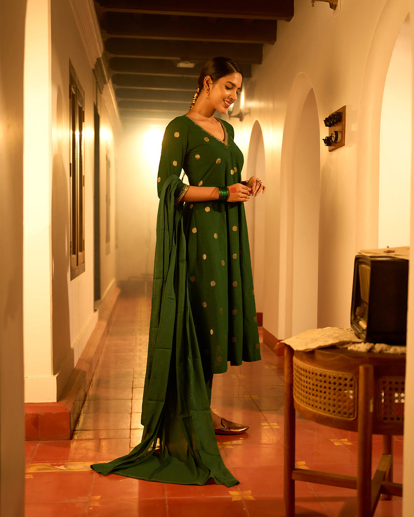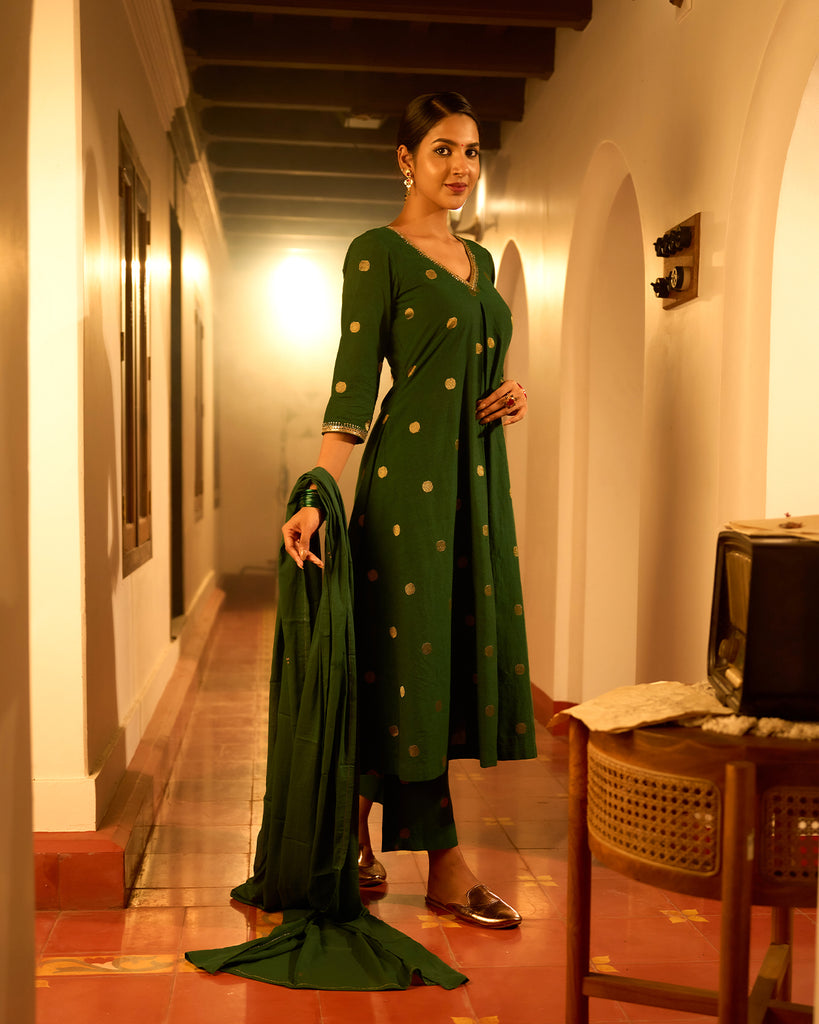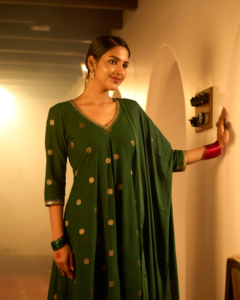A vibrant green flared kurta with a graceful semi-circular cut and a front box pleat for added movement. The wide V-neck and sleeves are beautifully detailed with antique gold hand embroidery, while all-over polka dot zari weaving adds a festive sparkle.