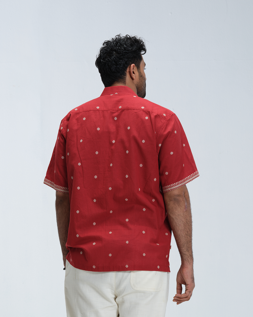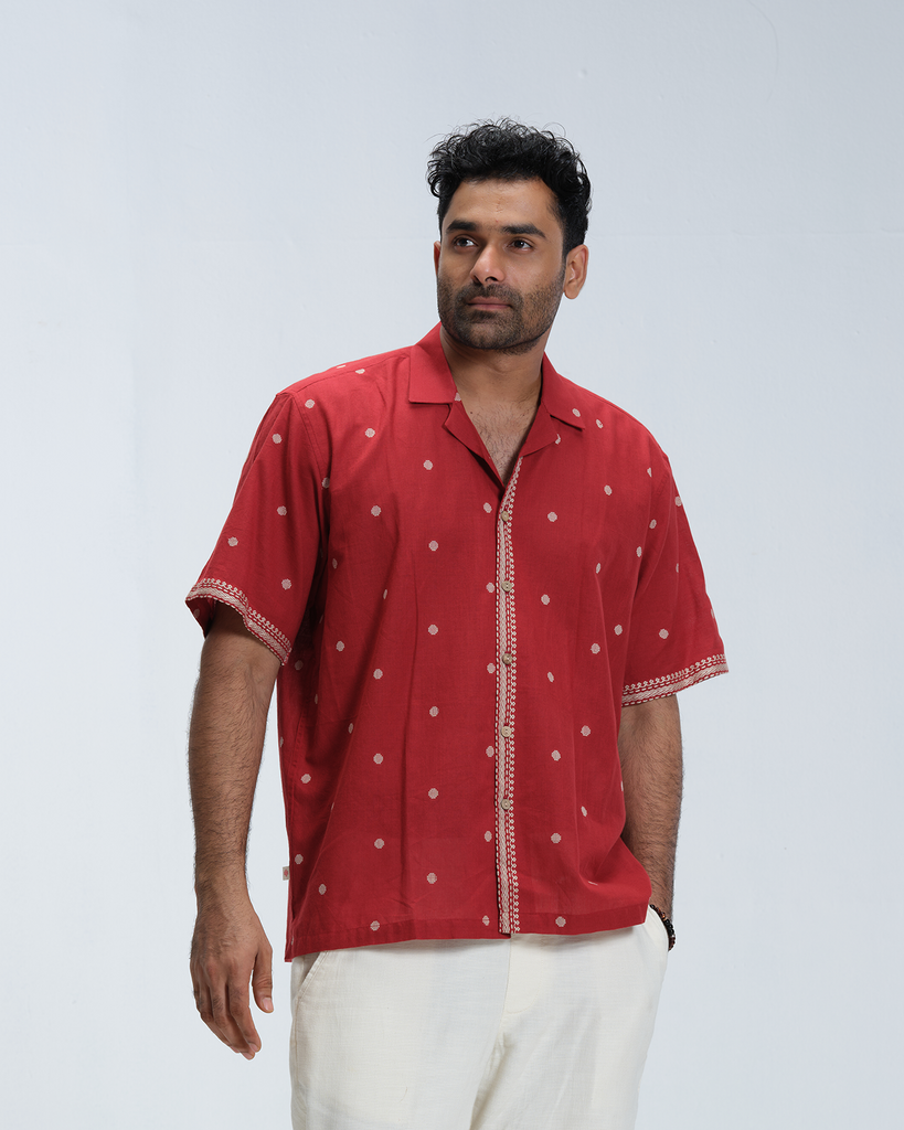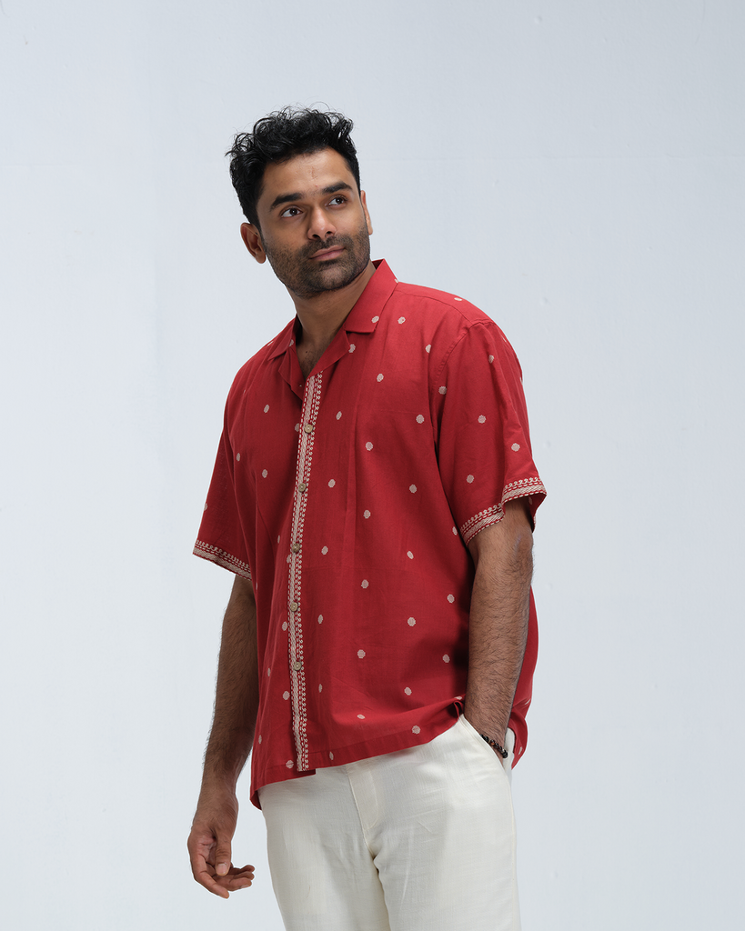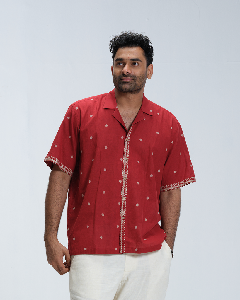 Stand out in this red South Cotton men's shirt, designed for comfort and style. It features a relaxed oversized fit, half sleeves, and a classic Cuban collar. The shirt is detailed with contrast butti weaving and border detailing on the front, sleeves, and back. Finished with wooden buttons and a straight-cut hem, it's a perfect blend of modern and traditional.