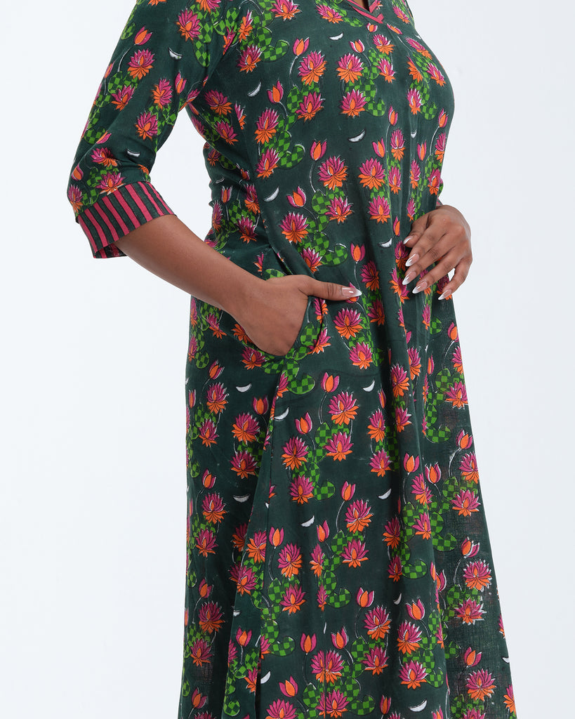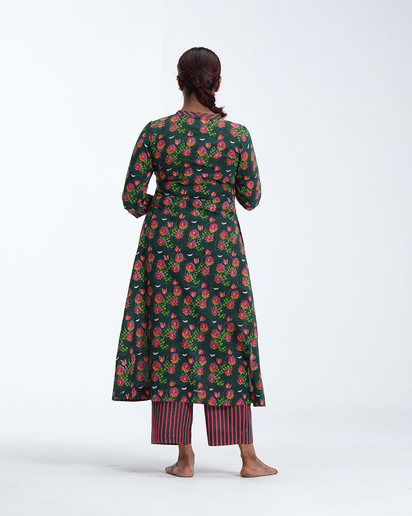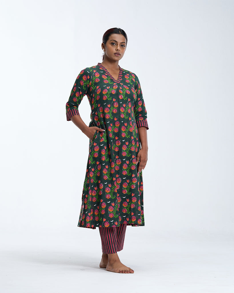 Our Green Aambal Printed A-line Kurta is crafted for comfort and effortless style. Designed with a flattering A-line silhouette and front pleats for added ease, it ensures a relaxed yet refined fit. The 3/4th sleeves and side pockets add functionality, while the low slits on both sides allow graceful movement. Adorned with soft Aambal-inspired prints, this kurta brings a touch of freshness and charm to your everyday wardrobe.