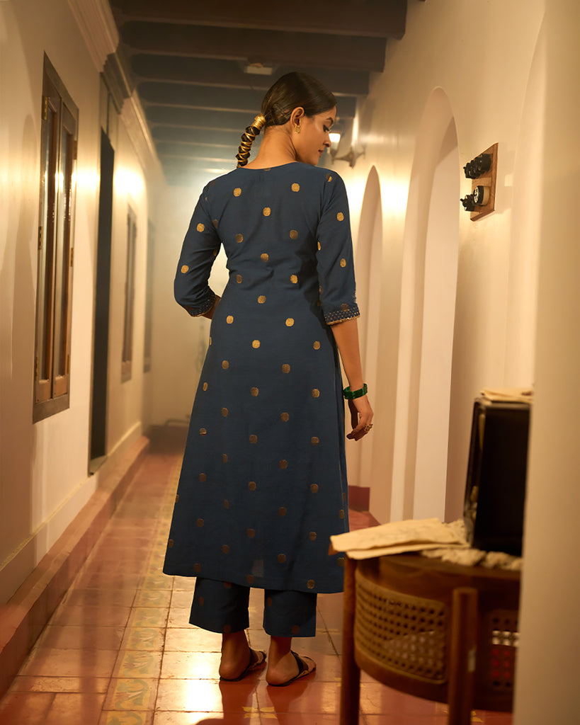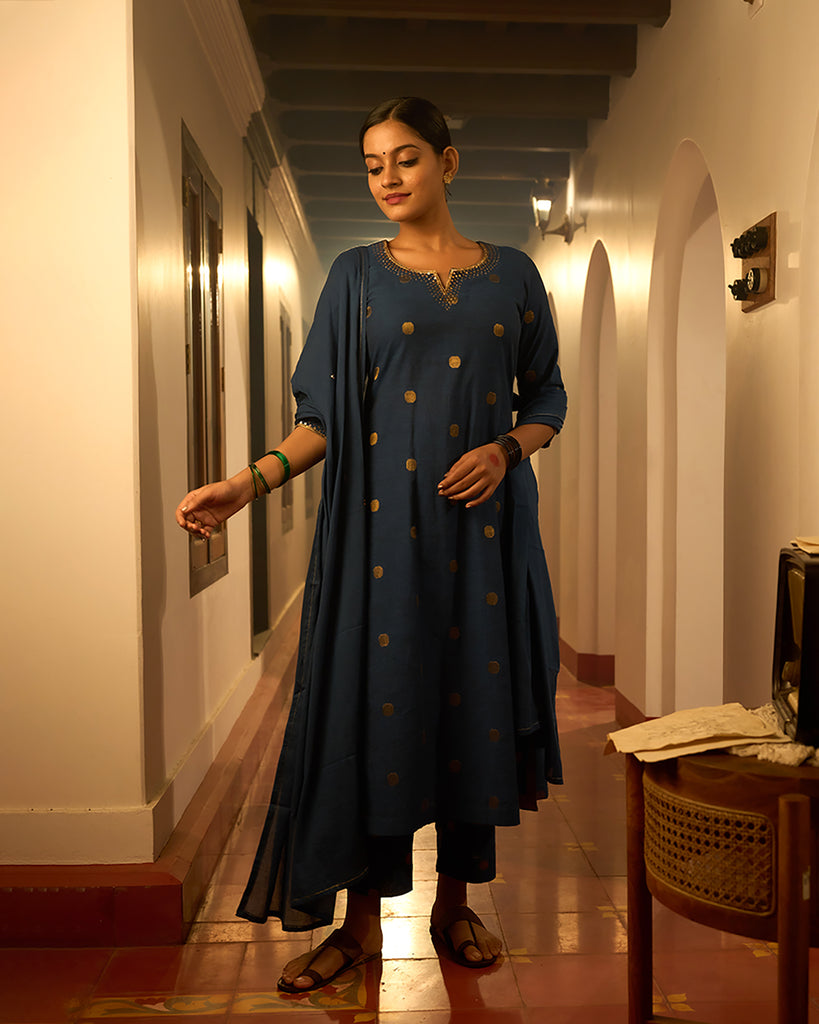 A chic blue A-line kurta with flare. Its neck and sleeves are adorned with antique gold hand embroidery, complementing the delicate polka dot zari weaving throughout.