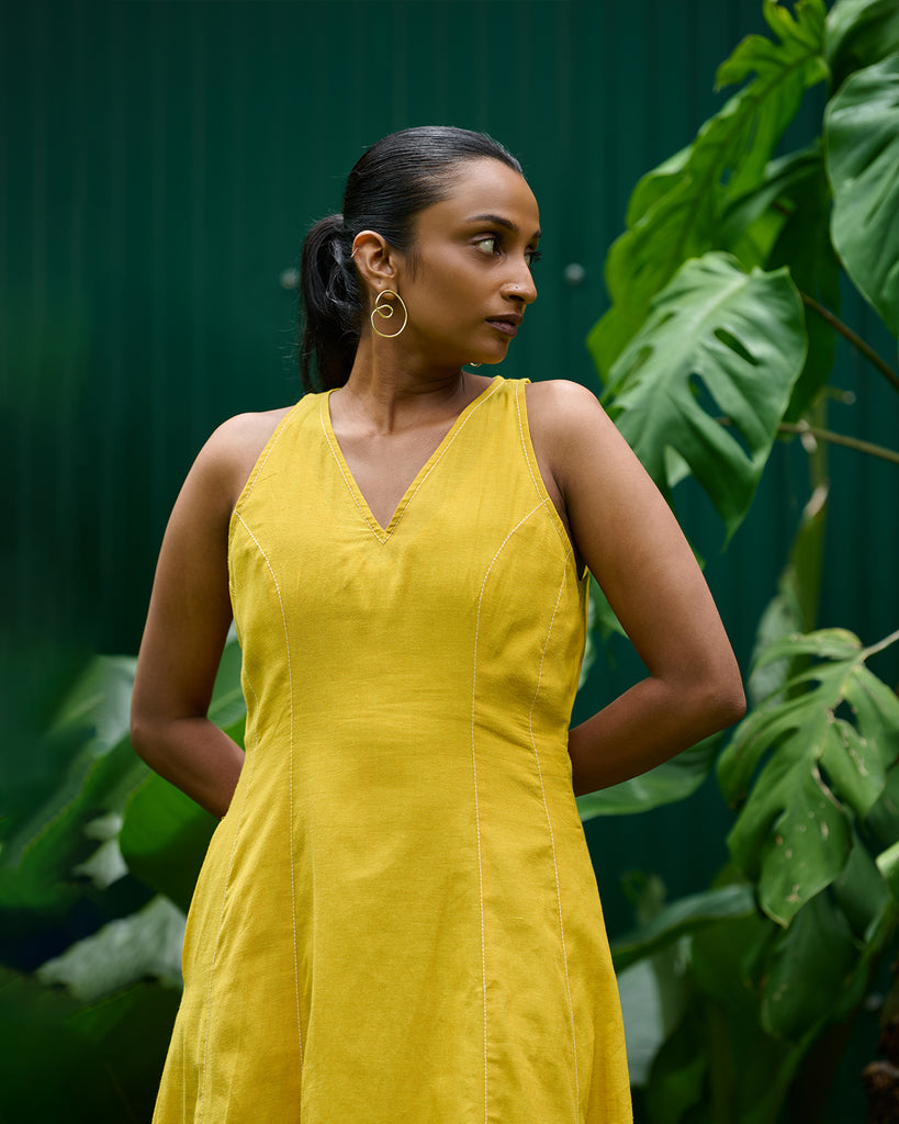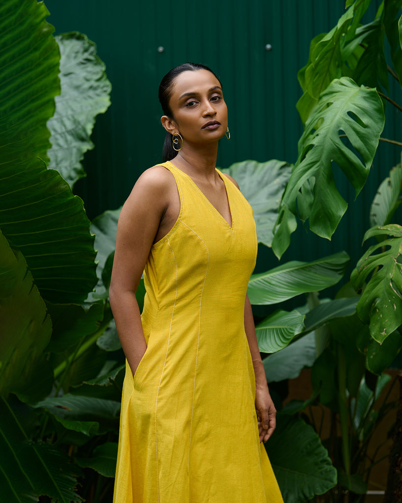 Embrace sunny style with our radiant mango yellow panneled maxi dress. This beautiful dress features a sleeveless, in-cut shoulder design and a sophisticated close V-neckline. The back boasts a close neck with a keyhole detail. Enjoy the convenience of side pockets, while contrast thread detailing on the necklines and panels adds an exquisite touch. A comfortable mull-mull slip is included.