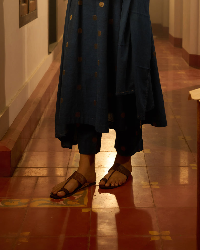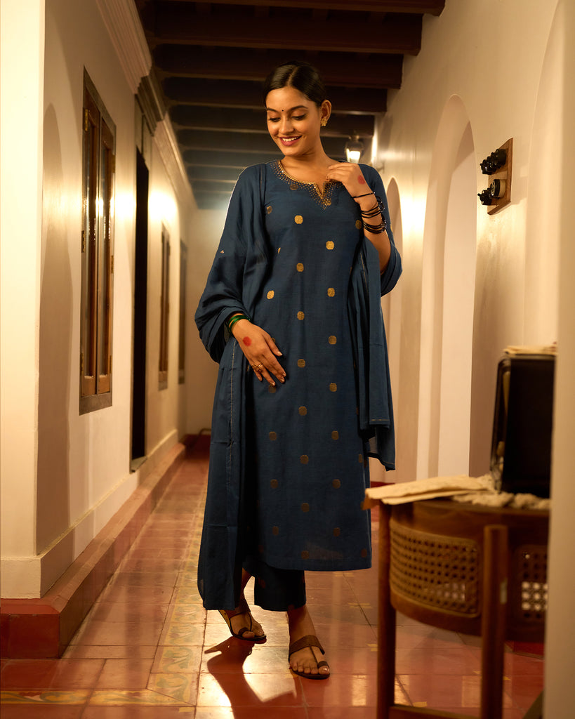 Our blue south cotton pants with a sleek design. The front band and back elastic ensure all-day comfort, while the semi-parallel bottom and golden zari dot weaving provide a stylish finish.