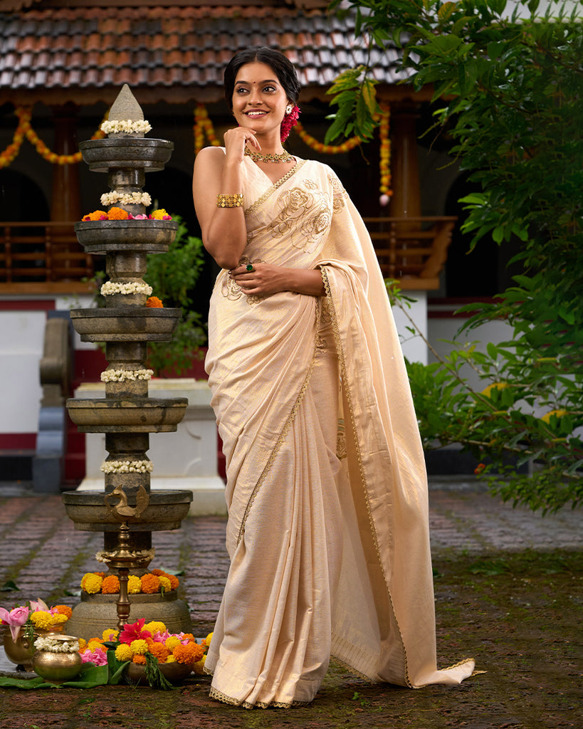 Golden soft cotton saree with exquisite embroidery, organza appliqué, and hand-highlighted flowers. Finished with a delicate crochet lace border. Paired with a beautiful off-white and gold striped blouse piece. Simple elegance!