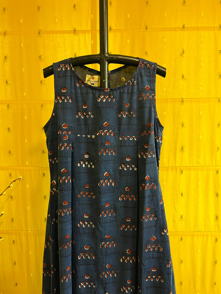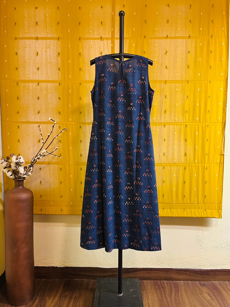 This indigo hand block print sleeveless dress has an A-line cut with a chest yoke and box pleats. It features a front boat neck and a back keyhole opening. Both the neck and armholes are highlighted with maroon kantha stitching, and there are maroon details on the hemline. It has side pockets and sleeves attached inside.