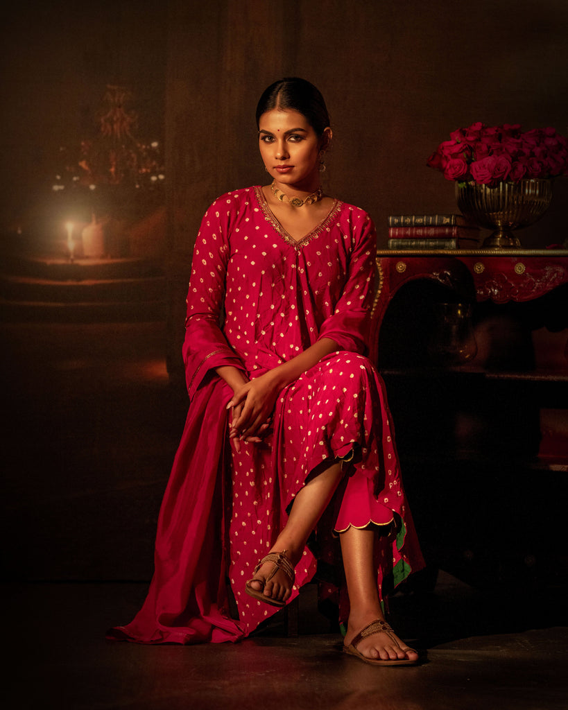 This Pink Bandhni flared kurta features front godets for added volume and a curved V-neckline with intricate handwork detailing. The 3/4th sleeves also showcase delicate handwork, while the green-facing hemline adds a subtle contrast, making it perfect for festive and elegant wear.