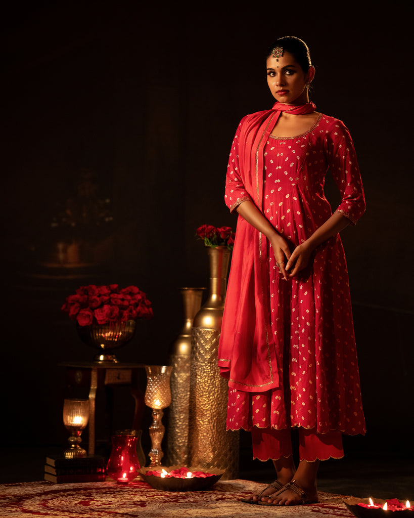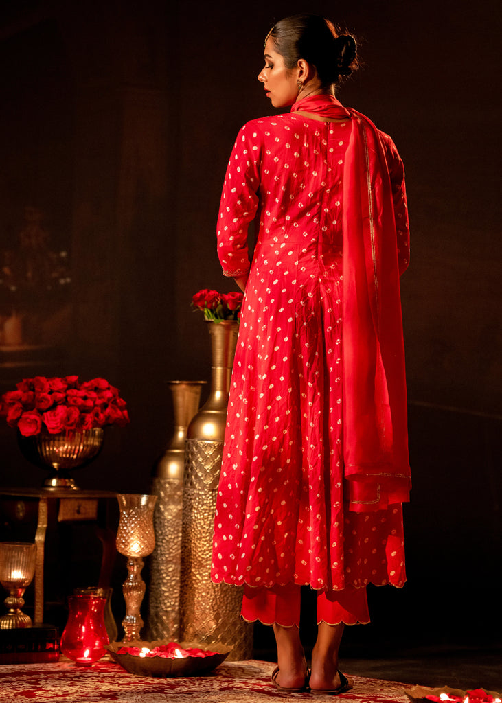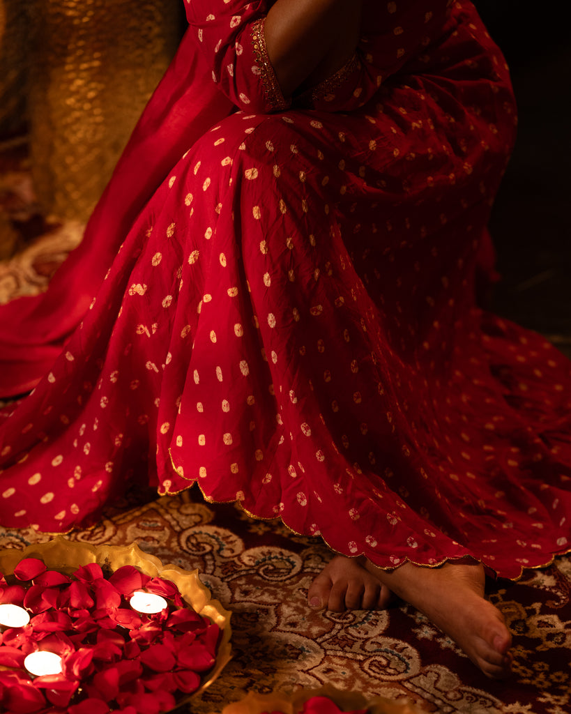 This Red Bandhni Anarkali features a front yoke adorned with intricate Zardozi and Pitta work, adding elegance to its wide neckline with delicate hand embroidery. Designed with 3/4th sleeves and panel cuts for a flowing silhouette, the hemline is highlighted with gold zeri scallops, making it an exquisite choice for festive occasions.