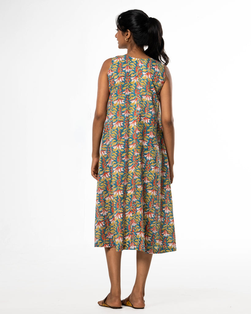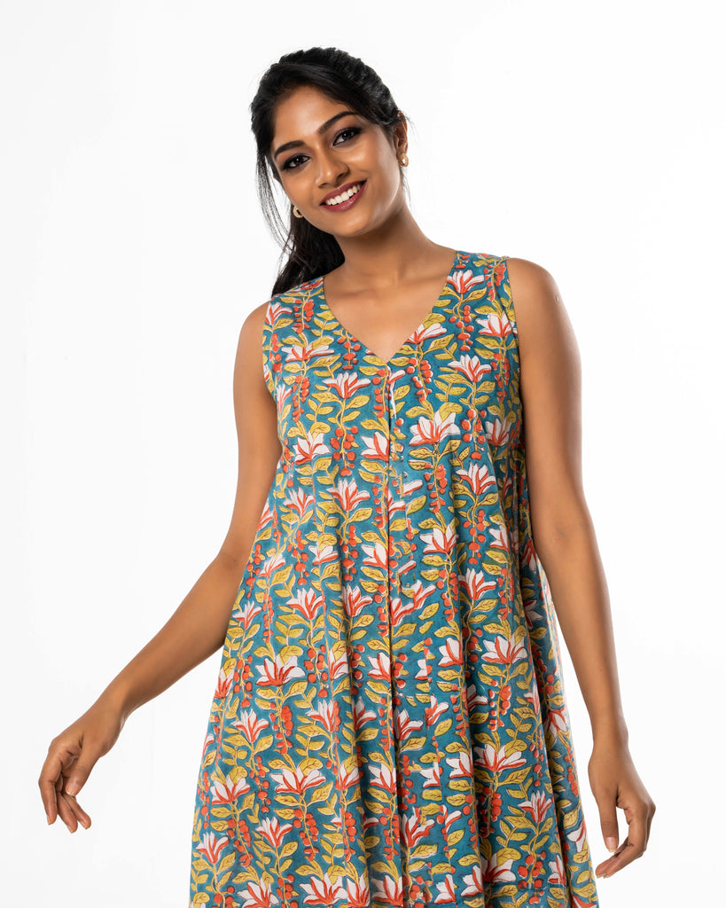 Teal Blue sleeveless dress crafted from hand-block printed fabric, featuring a V-neckline and convenient side pocket. A perfect blend of style and comfort, ideal for casual wear.
